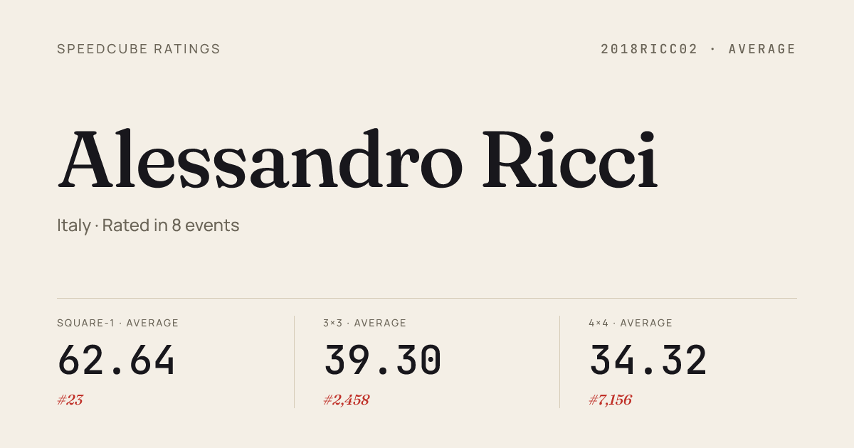 Feb 22, 2026Clock · Round 2BelliinZona2026 · 20th9.93Feb 22, 2026Clock · Round 1BelliinZona2026 · 19th10.41Feb 22, 2026Skewb · Round 1BelliinZona2026 · 26th8.57Feb 22, 2026Skewb · Round 2BelliinZona2026 · 29th8.40Feb 22, 2026Skewb · FinalBelliinZona2026 · 24th9.02Feb 22, 2026Square-1 · Round 2BelliinZona2026 · 1st7.93Feb 22, 2026Square-1 · Round 1BelliinZona2026 · 1st7.91Feb 22, 2026Square-1 · FinalBelliinZona2026 · 1st7.27Dec 8, 20252x2x2 Cube · Round 2ItalianChampionship2025 · national · 24th3.33Dec 8, 20252x2x2 Cube · Round 1ItalianChampionship2025 · national · 39th3.57Dec 8, 20253x3x3 Cube · Round 1ItalianChampionship2025 · national · 76th11.79Dec 8, 20253x3x3 Cube · Semi-FinalItalianChampionship2025 · national · 45th10.58Dec 8, 20253x3x3 Cube · Round 2ItalianChampionship2025 · national · 43rd10.43Dec 8, 20253x3x3 One-Handed · Round 1ItalianChampionship2025 · national · 60th22.89Dec 8, 20254x4x4 Cube · Round 1ItalianChampionship2025 · national · 110th53.50Dec 8, 2025Clock · Round 1ItalianChampionship2025 · national · 56th11.49Dec 8, 2025Skewb · Round 1ItalianChampionship2025 · national · 95th10.20Dec 8, 2025Square-1 · FinalItalianChampionship2025 · national · 1st6.33Dec 8, 2025Square-1 · Round 1ItalianChampionship2025 · national · 1st7.19