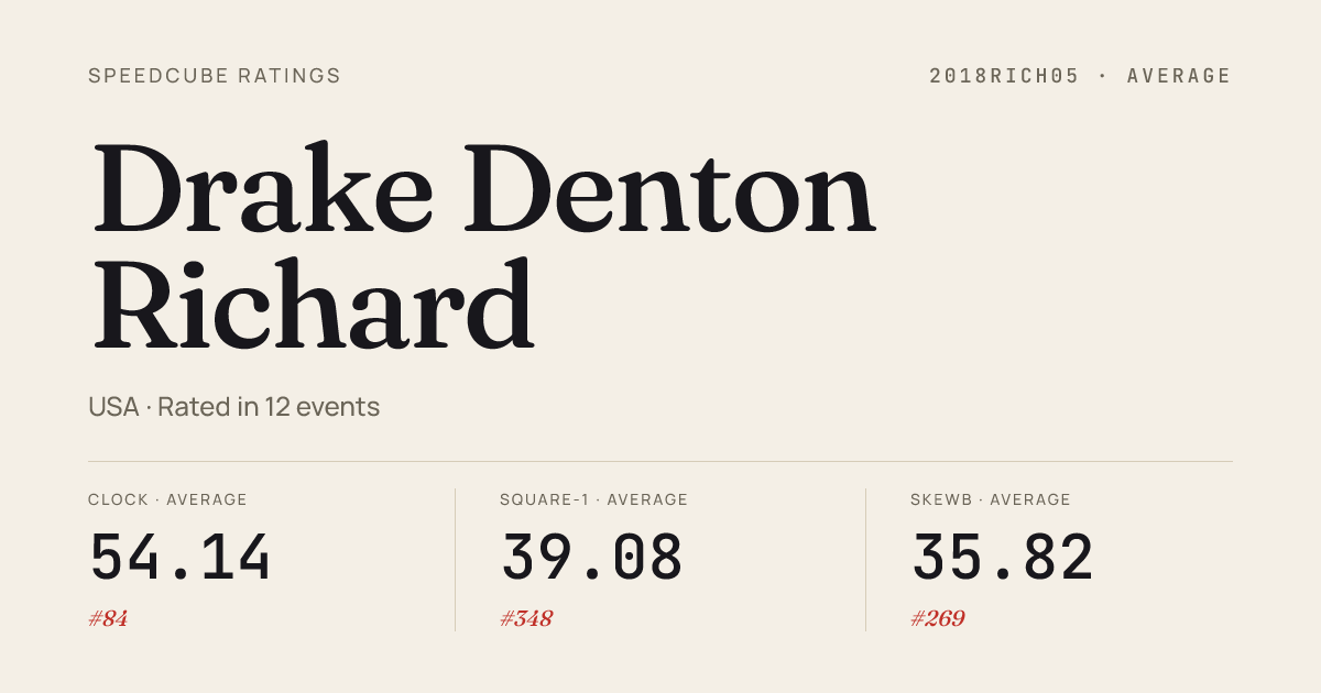 Apr 11, 20266x6x6 Cube · Combined FinalCubeAgainstCancerRoswell2026 · 29th3:21.95Apr 11, 2026Clock · FinalCubeAgainstCancerRoswell2026 · 1st3.37Apr 11, 2026Clock · Round 1CubeAgainstCancerRoswell2026 · 5th5.47Apr 11, 2026Skewb · FinalCubeAgainstCancerRoswell2026 · 4th3.39Apr 11, 2026Skewb · Round 1CubeAgainstCancerRoswell2026 · 9th4.06Apr 11, 2026Square-1 · FinalCubeAgainstCancerRoswell2026 · 2nd9.77Apr 11, 2026Square-1 · Round 1CubeAgainstCancerRoswell2026 · 1st11.61Mar 29, 20265x5x5 Cube · Round 1GACubersWarmUp2026 · 10th1:33.73Mar 29, 20265x5x5 Cube · FinalGACubersWarmUp2026 · 12th1:45.02Mar 29, 2026Clock · Round 1GACubersWarmUp2026 · 2nd4.62Mar 29, 2026Clock · FinalGACubersWarmUp2026 · 6th5.84Mar 29, 2026Square-1 · Round 1GACubersWarmUp2026 · 1st11.05Mar 29, 2026Square-1 · FinalGACubersWarmUp2026 · 1st9.71Mar 21, 20263x3x3 Cube · Round 1MiddleGeorgiaMarchMadness2026 · 19th11.38Mar 21, 20263x3x3 Cube · FinalMiddleGeorgiaMarchMadness2026 · 13th10.40Mar 21, 20263x3x3 Cube · Round 2MiddleGeorgiaMarchMadness2026 · 23rd13.40Mar 21, 20264x4x4 Cube · Round 1MiddleGeorgiaMarchMadness2026 · 21st50.80Mar 21, 20267x7x7 Cube · Round 1MiddleGeorgiaMarchMadness2026 · 21st6:25.16Mar 21, 2026Clock · Round 1MiddleGeorgiaMarchMadness2026 · 1st3.36Mar 21, 2026Clock · FinalMiddleGeorgiaMarchMadness2026 · 11th3.19