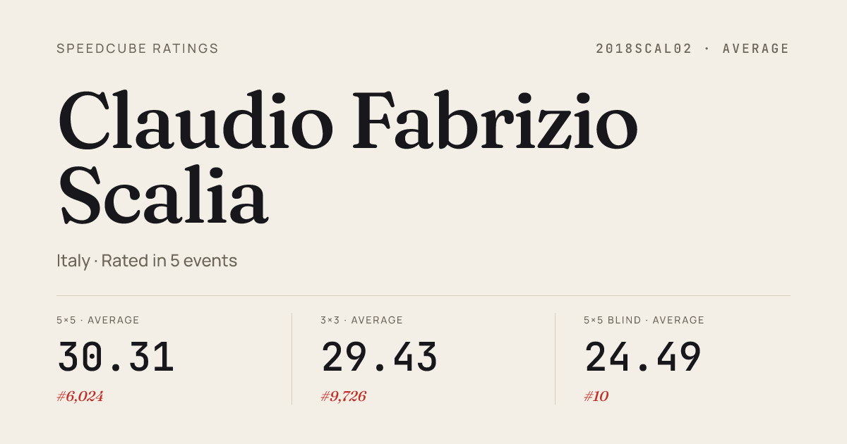 Feb 1, 20264x4x4 Blindfolded · FinalMiniMentalMilanoVIII2026 · 3rd3:36.34Nov 23, 20255x5x5 Blindfolded · FinalMiniMentalMilanoVII2025 · 4th13:54.00Sep 21, 20255x5x5 Blindfolded · FinalMiniMentalMilanoVI2025 · 3rd16:05.00Jul 20, 20253x3x3 Cube · Round 1SicilySummer2025 · 6th10.82Jul 20, 20253x3x3 Cube · FinalSicilySummer2025 · 16th13.35Jul 20, 20253x3x3 Cube · Round 2SicilySummer2025 · 10th11.74Jul 20, 20253x3x3 Blindfolded · FinalSicilySummer2025 · 1st53.01Jun 2, 20253x3x3 Blindfolded · FinalPpiFauriAstutitiSicily2025 · 1st1:01.44Jun 2, 20254x4x4 Blindfolded · FinalPpiFauriAstutitiSicily2025 · 1st4:56.25Jun 2, 20255x5x5 Blindfolded · FinalPpiFauriAstutitiSicily2025 · 1st14:13.00Apr 27, 20254x4x4 Blindfolded · Round 1MiniMentalMilanoIII2025 · 4th5:54.69Apr 27, 20254x4x4 Blindfolded · FinalMiniMentalMilanoIII2025 · 3rd5:21.32Apr 27, 20255x5x5 Blindfolded · FinalMiniMentalMilanoIII2025 · 5th15:06.00Mar 23, 20253x3x3 Blindfolded · FinalCalabriaOpen2025 · 1st52.47Mar 23, 20255x5x5 Cube · Round 1CalabriaOpen2025 · 13th1:41.77Feb 16, 20253x3x3 Cube · Round 2SandaWinter2025 · 18th11.39Feb 16, 20253x3x3 Cube · Round 1SandaWinter2025 · 23rd12.88Feb 16, 20253x3x3 Cube · FinalSandaWinter2025 · 19th11.65Feb 16, 20253x3x3 Blindfolded · FinalSandaWinter2025 · 3rd47.43Feb 16, 20253x3x3 Multi-Blind · FinalSandaWinter2025 · 3rd10/11 in 43:11