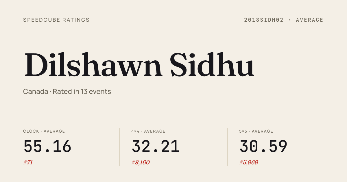Apr 19, 2025Clock · Round 2AldergroveClockFest2025 · 1st3.36Apr 19, 2025Clock · FinalAldergroveClockFest2025 · 2nd3.19Apr 19, 2025Skewb · Round 1AldergroveClockFest2025 · 19th7.60Apr 19, 2025Square-1 · Combined FinalAldergroveClockFest2025 · 9th18.47Feb 22, 20253x3x3 Cube · Round 1ChillCubinginChilliwack2025 · 21st11.91Feb 22, 20253x3x3 Cube · Round 2ChillCubinginChilliwack2025 · 21st12.01Feb 22, 20253x3x3 One-Handed · Round 1ChillCubinginChilliwack2025 · 21st27.50Feb 22, 20254x4x4 Cube · Combined FinalChillCubinginChilliwack2025 · 20th52.46Feb 22, 2025Pyraminx · FinalChillCubinginChilliwack2025 · 5th4.60Feb 22, 2025Pyraminx · Round 1ChillCubinginChilliwack2025 · 6th4.94Jan 4, 20252x2x2 Cube · FinalMapleRidgeFavourites2025 · 2nd2.35Jan 4, 20253x3x3 Cube · Round 1MapleRidgeFavourites2025 · 21st10.48Jan 4, 20253x3x3 Blindfolded · FinalMapleRidgeFavourites2025 · 8th3:05.66Jan 4, 2025Clock · Combined FinalMapleRidgeFavourites2025 · 2nd4.35Oct 20, 20242x2x2 Cube · FinalVancouverSouthlandsSprint2024 · 14th4.26Oct 20, 20242x2x2 Cube · Round 1VancouverSouthlandsSprint2024 · 5th2.54Oct 20, 20242x2x2 Cube · Round 2VancouverSouthlandsSprint2024 · 6th2.75Oct 20, 20243x3x3 Cube · Round 2VancouverSouthlandsSprint2024 · 27th11.18Oct 20, 20243x3x3 Cube · Semi-FinalVancouverSouthlandsSprint2024 · 20th10.56