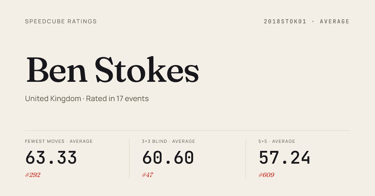 - Apr 18, 20263x3x3 Blindfolded · FinalBrighton3x3Day2026 · 1st23.56
