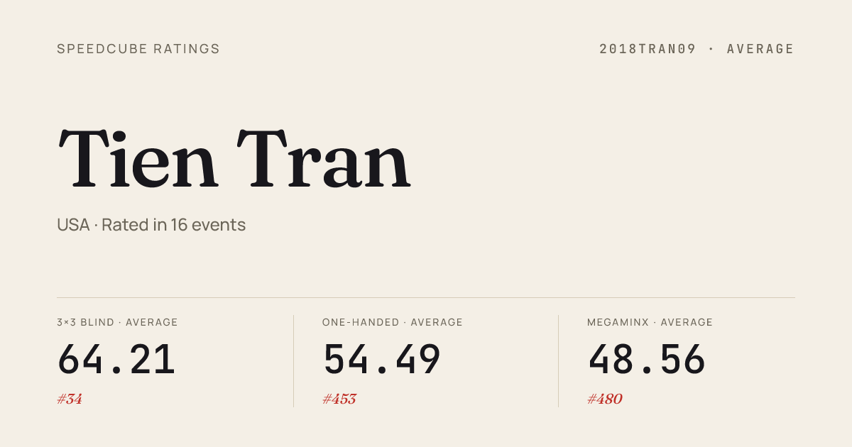 - Apr 14, 20263x3x3 Cube · FinalGeorgiaTechTuesdayTinyI2026 · 8th10.88