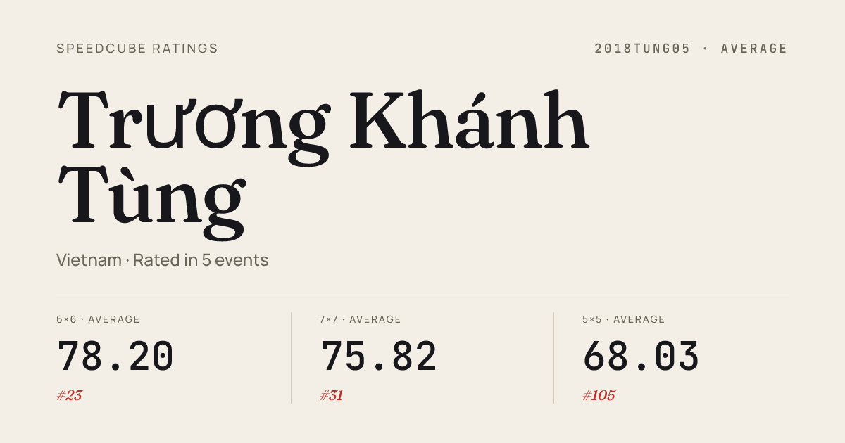 Mar 22, 20264x4x4 Cube · Round 1MYHMHaNxNoi2026 · 12th32.41Mar 22, 20265x5x5 Cube · FinalMYHMHaNxNoi2026 · 6th49.93Mar 22, 20265x5x5 Cube · Round 1MYHMHaNxNoi2026 · 6th50.78Mar 22, 20266x6x6 Cube · FinalMYHMHaNxNoi2026 · 3rd1:22.25Mar 22, 20266x6x6 Cube · Round 1MYHMHaNxNoi2026 · 4th1:22.43Mar 22, 20267x7x7 Cube · Round 1MYHMHaNxNoi2026 · 4th2:07.45Mar 22, 20267x7x7 Cube · FinalMYHMHaNxNoi2026 · 4th2:10.22Sep 21, 20253x3x3 Cube · Round 1HanoiSummer2025 · 11th8.76Sep 21, 20253x3x3 Cube · Round 2HanoiSummer2025 · 28th10.11Sep 21, 20254x4x4 Cube · FinalHanoiSummer2025 · 8th29.33Sep 21, 20254x4x4 Cube · Round 1HanoiSummer2025 · 7th30.40Sep 21, 20255x5x5 Cube · Round 1HanoiSummer2025 · 3rd50.81Sep 21, 20255x5x5 Cube · FinalHanoiSummer2025 · 4th53.30Sep 21, 20256x6x6 Cube · Combined FinalHanoiSummer2025 · 1st1:34.99Sep 21, 20257x7x7 Cube · Combined FinalHanoiSummer2025 · 1st1:59.04Aug 17, 20253x3x3 Cube · Round 1VietnamChampionship2025 · national · 60th10.28Aug 17, 20254x4x4 Cube · FinalVietnamChampionship2025 · national · 14th31.13Aug 17, 20254x4x4 Cube · Round 1VietnamChampionship2025 · national · 11th30.01Aug 17, 20255x5x5 Cube · Round 1VietnamChampionship2025 · national · 5th51.26