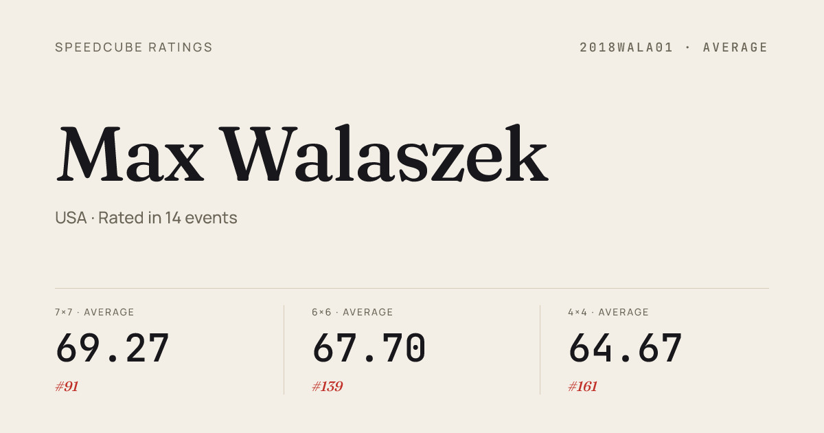 Feb 7, 20264x4x4 Cube · Round 2DeerfieldDodecahedrons2026 · 3rd28.59Feb 7, 20264x4x4 Cube · FinalDeerfieldDodecahedrons2026 · 5th29.07Feb 7, 2026Megaminx · Round 1DeerfieldDodecahedrons2026 · 5th51.70Feb 7, 2026Megaminx · Round 2DeerfieldDodecahedrons2026 · 8th53.13Feb 7, 2026Megaminx · FinalDeerfieldDodecahedrons2026 · 7th51.58Feb 7, 2026Square-1 · Round 1DeerfieldDodecahedrons2026 · 5th13.42Feb 7, 2026Square-1 · Round 2DeerfieldDodecahedrons2026 · 7th13.62Feb 7, 2026Square-1 · FinalDeerfieldDodecahedrons2026 · 9th15.69Dec 21, 20253x3x3 Blindfolded · Round 1MadisonMistletOH2025 · 12th2:35.03Dec 21, 20253x3x3 One-Handed · Round 2MadisonMistletOH2025 · 8th14.96Dec 21, 20253x3x3 One-Handed · FinalMadisonMistletOH2025 · 7th15.11Dec 21, 20253x3x3 One-Handed · Round 1MadisonMistletOH2025 · 6th14.55Dec 21, 20256x6x6 Cube · Round 1MadisonMistletOH2025 · 5th1:41.62Dec 21, 20256x6x6 Cube · FinalMadisonMistletOH2025 · 4th1:33.60Dec 21, 20257x7x7 Cube · Round 1MadisonMistletOH2025 · 4th2:22.63Dec 21, 20257x7x7 Cube · FinalMadisonMistletOH2025 · 3rd2:20.17Dec 21, 2025Megaminx · Combined FinalMadisonMistletOH2025 · 8th54.63Dec 21, 2025Megaminx · Round 1MadisonMistletOH2025 · 6th57.61Dec 6, 20252x2x2 Cube · FinalEvanstonFallFavoritesA2025 · 1st2.12Dec 6, 20253x3x3 Cube · Round 1EvanstonFallFavoritesA2025 · 1st8.82