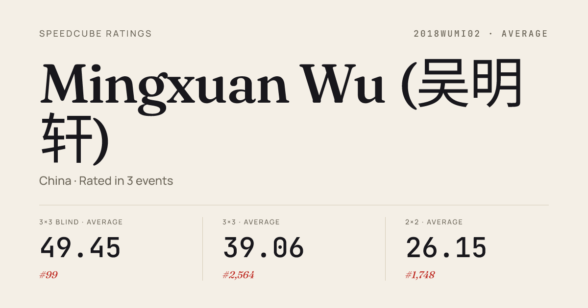 Sep 21, 20253x3x3 Blindfolded · FinalShenyangAutumn2025 · 2nd21.24Apr 13, 20252x2x2 Cube · Round 1ShenyangSpring2025 · 10th2.87Apr 13, 20252x2x2 Cube · FinalShenyangSpring2025 · 8th2.95Apr 13, 20253x3x3 Cube · Round 1ShenyangSpring2025 · 36th10.39Apr 13, 20253x3x3 Cube · Round 2ShenyangSpring2025 · 25th9.47Apr 13, 20253x3x3 Blindfolded · FinalShenyangSpring2025 · 1st18.97Apr 13, 20253x3x3 Blindfolded · Round 1ShenyangSpring2025 · 1st25.34Apr 13, 2025Clock · Round 1ShenyangSpring2025 · 42nd12.31Sep 16, 20242x2x2 Cube · Round 1DalianOpen2024 · 8th2.70Sep 16, 20242x2x2 Cube · FinalDalianOpen2024 · 14th3.22Sep 16, 20243x3x3 Cube · Round 2DalianOpen2024 · 19th8.70Sep 16, 20243x3x3 Cube · Round 1DalianOpen2024 · 22nd9.25Sep 16, 20243x3x3 Blindfolded · FinalDalianOpen2024 · 1st22.07Sep 16, 20243x3x3 Blindfolded · Round 1DalianOpen2024 · 1st28.95May 19, 20242x2x2 Cube · Round 1ZiboOpen2024 · 16th3.22May 19, 20242x2x2 Cube · FinalZiboOpen2024 · 9th2.85May 19, 20243x3x3 Cube · Round 2ZiboOpen2024 · 50th11.92May 19, 20243x3x3 Cube · Round 1ZiboOpen2024 · 59th12.91May 19, 20243x3x3 Blindfolded · FinalZiboOpen2024 · 3rd32.50