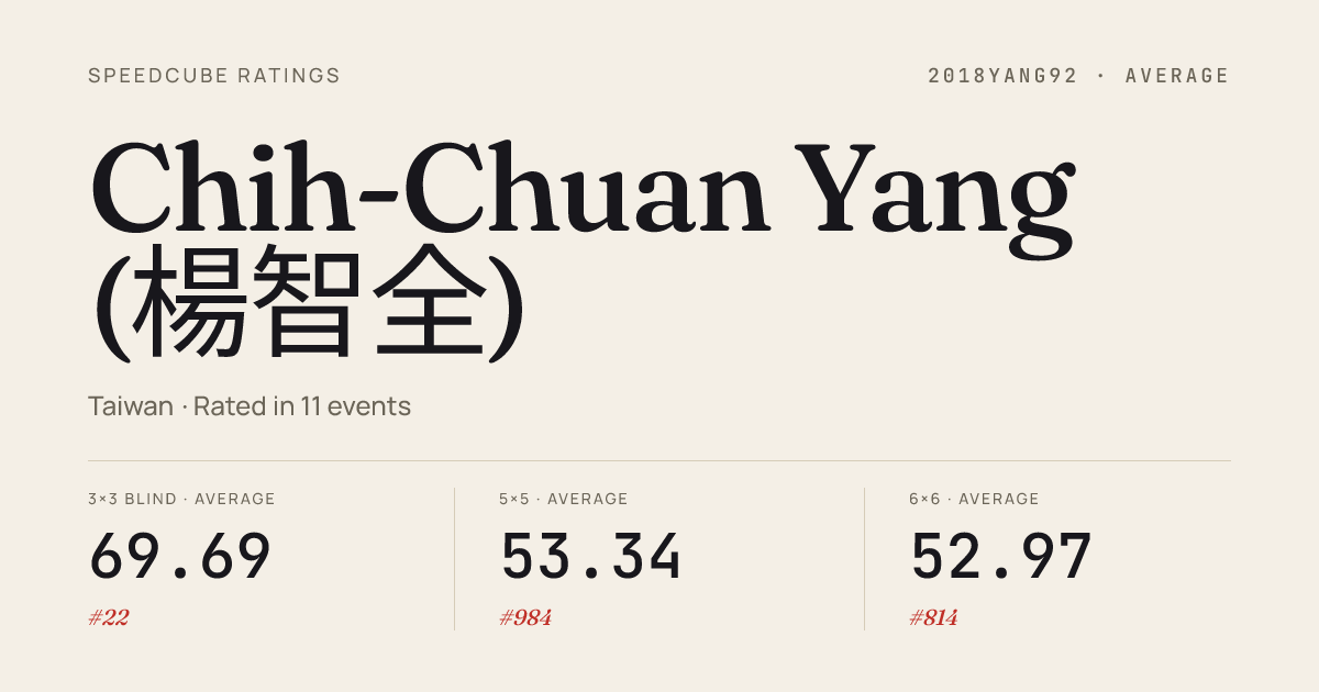 - Apr 6, 20263x3x3 Multi-Blind · Round 1PleaseDontDNFKaohsiung2026 · 13th9/17 in 56:11