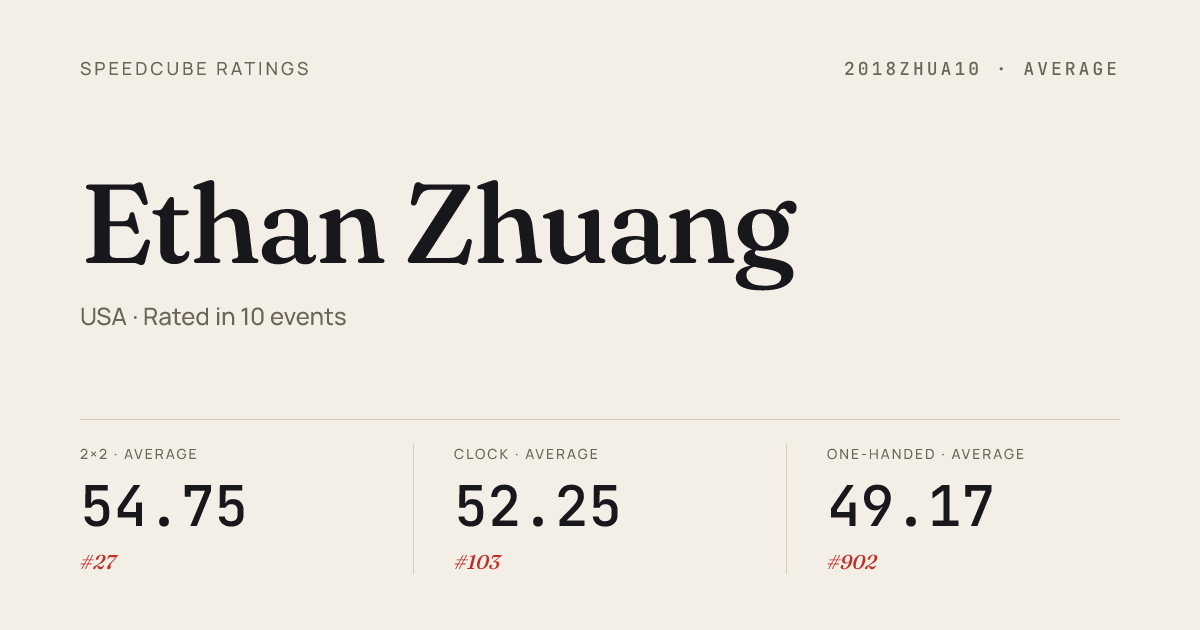 Apr 4, 20265x5x5 Cube · Round 1WakefieldMASpring2026 · 21st1:48.86Apr 4, 2026Megaminx · Combined FinalWakefieldMASpring2026 · 16th1:36.48Apr 4, 2026Pyraminx · FinalWakefieldMASpring2026 · 3rd3.37Apr 4, 2026Skewb · FinalWakefieldMASpring2026 · 1st3.17Mar 21, 20263x3x3 Cube · FinalCubeAgainstCancerBoston2026 · 2nd7.42Mar 21, 20263x3x3 Cube · Round 1CubeAgainstCancerBoston2026 · 3rd8.06Mar 21, 20263x3x3 Cube · Round 2CubeAgainstCancerBoston2026 · 6th8.29Mar 21, 20264x4x4 Cube · Round 1CubeAgainstCancerBoston2026 · 12th37.28Mar 21, 20264x4x4 Cube · FinalCubeAgainstCancerBoston2026 · 10th47.24Mar 21, 20265x5x5 Cube · Round 1CubeAgainstCancerBoston2026 · 25th1:48.82Mar 21, 2026Megaminx · Combined FinalCubeAgainstCancerBoston2026 · 16th1:31.89Mar 21, 2026Square-1 · Combined FinalCubeAgainstCancerBoston2026 · 2nd10.52Feb 21, 20262x2x2 Cube · FinalBrownCubingDay2026 · 1st1.46Feb 21, 20262x2x2 Cube · Round 1BrownCubingDay2026 · 1st1.40Feb 21, 20263x3x3 Cube · Round 1BrownCubingDay2026 · 4th8.62Feb 21, 20263x3x3 Cube · FinalBrownCubingDay2026 · 1st7.35Feb 21, 20263x3x3 One-Handed · Round 1BrownCubingDay2026 · 7th17.54Feb 21, 20263x3x3 One-Handed · FinalBrownCubingDay2026 · 4th15.45Feb 21, 20264x4x4 Cube · Round 1BrownCubingDay2026 · 11th42.54