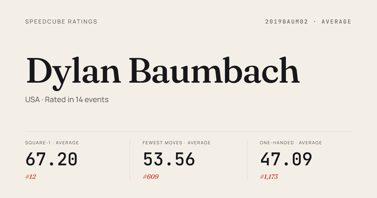 Oct 5, 20253x3x3 One-Handed · Round 1DFWCubingFall2025 · 3rd16.72Oct 5, 2025Square-1 · FinalDFWCubingFall2025 · 2nd7.87Oct 5, 2025Square-1 · Round 1DFWCubingFall2025 · 1st6.02Jul 6, 20253x3x3 Cube · Round 1WC2025 · world · 219th8.18Jul 6, 20253x3x3 Cube · Round 2WC2025 · world · 554th10.44Jul 6, 2025Pyraminx · Round 1WC2025 · world · 400th5.17May 18, 20253x3x3 Cube · Round 1DFWQualifier2025 · 7th10.11May 18, 2025Square-1 · Round 1DFWQualifier2025 · 1st6.68Dec 8, 20242x2x2 Cube · Round 2CubeaToninArlington2024 · 28th4.22Dec 8, 20242x2x2 Cube · Round 1CubeaToninArlington2024 · 2nd2.00Dec 8, 20243x3x3 Cube · FinalCubeaToninArlington2024 · 3rd7.51Dec 8, 20243x3x3 Cube · Semi-FinalCubeaToninArlington2024 · 4th8.10Dec 8, 20243x3x3 Cube · Round 1CubeaToninArlington2024 · 2nd7.30Dec 8, 20243x3x3 Cube · Round 2CubeaToninArlington2024 · 2nd6.98Dec 8, 20243x3x3 One-Handed · Round 1CubeaToninArlington2024 · 5th13.80Dec 8, 20243x3x3 One-Handed · FinalCubeaToninArlington2024 · 5th13.90Dec 8, 20244x4x4 Cube · Round 1CubeaToninArlington2024 · 56th27.69Dec 8, 2024Clock · Round 1CubeaToninArlington2024 · 34th5.33Dec 8, 2024Pyraminx · Round 1CubeaToninArlington2024 · 2nd3.72