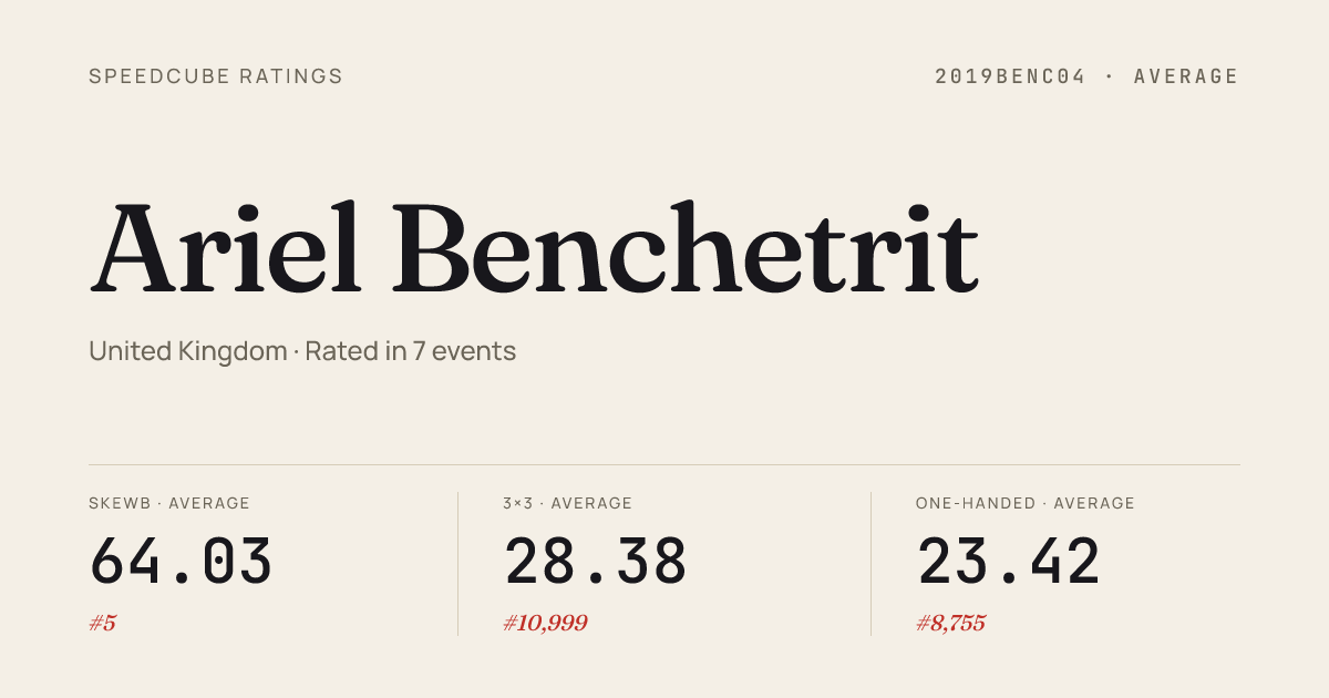 Mar 8, 2026Skewb · FinalWiltshireSpring2026 · 1st1.57Feb 22, 20263x3x3 Cube · Round 2CreweWinter2026 · 40th13.84Feb 22, 20263x3x3 Cube · Round 1CreweWinter2026 · 33rd12.85Feb 22, 2026Skewb · FinalCreweWinter2026 · 1st2.49Feb 22, 2026Skewb · Round 1CreweWinter2026 · 1st1.76Jan 11, 20262x2x2 Cube · Round 1StevenageJanuary2026 · 42nd4.65Jan 11, 20262x2x2 Cube · FinalStevenageJanuary2026 · 40th4.49Jan 11, 2026Skewb · FinalStevenageJanuary2026 · 1st2.31Jan 11, 2026Skewb · Round 1StevenageJanuary2026 · 1st2.49Nov 9, 20252x2x2 Cube · Round 1Stevenage10thAnniversary2025 · 30th3.30Nov 9, 2025Clock · Combined FinalStevenage10thAnniversary2025 · 99th14.00Nov 9, 2025Skewb · FinalStevenage10thAnniversary2025 · 2nd3.87Oct 12, 20252x2x2 Cube · Round 1StevenageOctober2025 · 27th3.17Oct 12, 20252x2x2 Cube · Round 2StevenageOctober2025 · 31st3.46Oct 12, 2025Skewb · FinalStevenageOctober2025 · 1st2.22Oct 12, 2025Skewb · Round 1StevenageOctober2025 · 1st2.05Oct 12, 2025Skewb · Round 2StevenageOctober2025 · 2nd2.62Aug 24, 20252x2x2 Cube · Round 1RubiksUKChampionship2025 · national · 196th5.17Aug 24, 20253x3x3 Cube · Round 2RubiksUKChampionship2025 · national · 206th13.91
