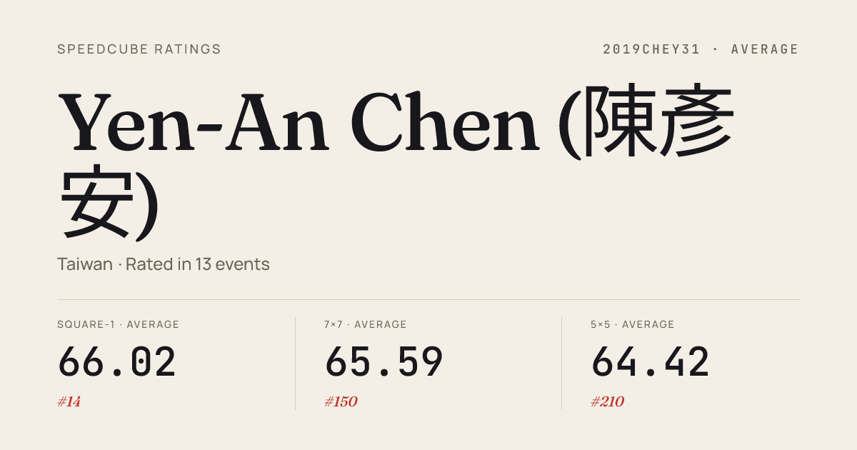Mar 14, 20264x4x4 Cube · FinalPenghuSpringCubeOpen2026 · 8th33.42Mar 14, 20264x4x4 Cube · Round 1PenghuSpringCubeOpen2026 · 5th31.11Mar 14, 2026Pyraminx · FinalPenghuSpringCubeOpen2026 · 6th4.19Mar 14, 2026Pyraminx · Round 1PenghuSpringCubeOpen2026 · 10th6.34Dec 28, 20253x3x3 Cube · FinalShinKongOpenTaitung2025 · 7th9.03Dec 28, 20253x3x3 Cube · Round 1ShinKongOpenTaitung2025 · 4th8.03Dec 28, 20253x3x3 Cube · Round 2ShinKongOpenTaitung2025 · 9th8.91Dec 21, 20252x2x2 Cube · FinalTaiwanChampionship2025 · 7th3.10Dec 21, 20252x2x2 Cube · Round 1TaiwanChampionship2025 · 8th2.39Dec 21, 20252x2x2 Cube · Round 2TaiwanChampionship2025 · 4th2.04Dec 21, 20253x3x3 Cube · Semi-FinalTaiwanChampionship2025 · 12th8.10Dec 21, 20253x3x3 Cube · Round 2TaiwanChampionship2025 · 31st8.91Dec 21, 20253x3x3 Cube · FinalTaiwanChampionship2025 · 7th8.42Dec 21, 20253x3x3 Cube · Round 1TaiwanChampionship2025 · 28th8.97Dec 21, 20254x4x4 Cube · Round 1TaiwanChampionship2025 · 13th29.24Dec 21, 20254x4x4 Cube · Round 2TaiwanChampionship2025 · 28th33.24Dec 21, 20255x5x5 Cube · FinalTaiwanChampionship2025 · 11th56.03Dec 21, 20255x5x5 Cube · Round 1TaiwanChampionship2025 · 13th51.91Dec 21, 20255x5x5 Cube · Round 2TaiwanChampionship2025 · 11th51.37