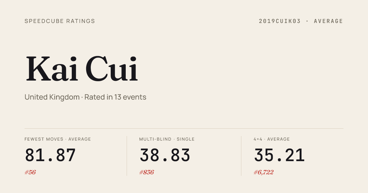Dec 14, 20255x5x5 Cube · Round 1WiltshireWinter2025 · 58th1:48.93Dec 14, 2025Clock · Round 1WiltshireWinter2025 · 34th10.22Dec 14, 2025Megaminx · Round 1WiltshireWinter2025 · 35th1:14.18Nov 9, 20252x2x2 Cube · Round 1Stevenage10thAnniversary2025 · 43rd3.73Nov 9, 20253x3x3 Cube · Round 2Stevenage10thAnniversary2025 · 70th12.27Nov 9, 20253x3x3 Cube · Round 1Stevenage10thAnniversary2025 · 58th11.67Nov 9, 20253x3x3 One-Handed · Combined FinalStevenage10thAnniversary2025 · 51st23.55Nov 9, 20254x4x4 Cube · Combined FinalStevenage10thAnniversary2025 · 64th50.15Nov 9, 20255x5x5 Cube · Combined FinalStevenage10thAnniversary2025 · 88th2:18.84Nov 9, 2025Clock · Combined FinalStevenage10thAnniversary2025 · 38th10.88Nov 9, 2025Megaminx · Combined FinalStevenage10thAnniversary2025 · 28th1:14.78Nov 9, 2025Pyraminx · FinalStevenage10thAnniversary2025 · 14th4.24Nov 9, 2025Skewb · FinalStevenage10thAnniversary2025 · 41st6.62Nov 9, 2025Square-1 · Combined FinalStevenage10thAnniversary2025 · 52nd43.04Sep 20, 20253x3x3 Fewest Moves · FinalFMCEurope2025 · 7th24.00Aug 24, 20252x2x2 Cube · Round 1RubiksUKChampionship2025 · national · 71st3.50Aug 24, 20252x2x2 Cube · Round 2RubiksUKChampionship2025 · national · 55th3.45Aug 24, 20253x3x3 Cube · Round 1RubiksUKChampionship2025 · national · 156th12.38Aug 24, 20253x3x3 Cube · Round 2RubiksUKChampionship2025 · national · 152nd11.92
