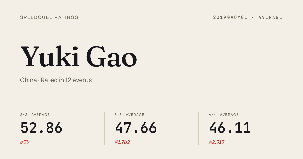 - Apr 12, 20263x3x3 Cube · Round 2USMPenangCube2026 · 6th9.92