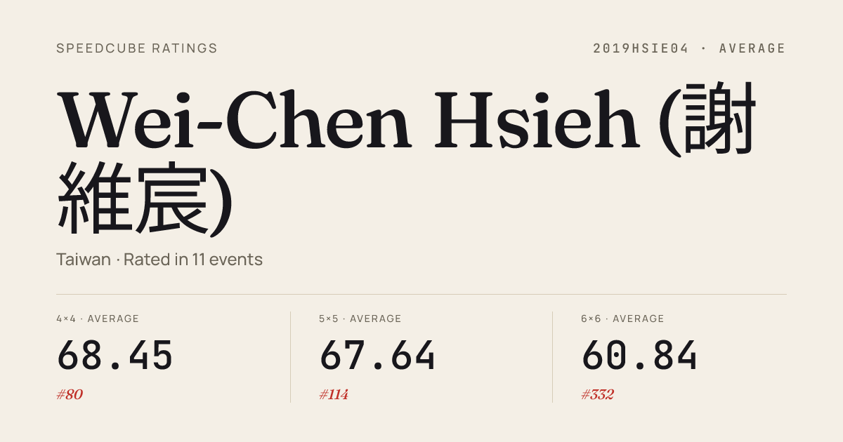 Mar 14, 20264x4x4 Cube · FinalPenghuSpringCubeOpen2026 · 2nd27.12Mar 14, 20264x4x4 Cube · Round 1PenghuSpringCubeOpen2026 · 2nd27.28Dec 28, 20253x3x3 Cube · Round 2ShinKongOpenTaitung2025 · 2nd7.42Dec 28, 20253x3x3 Cube · Round 1ShinKongOpenTaitung2025 · 3rd7.72Dec 28, 20253x3x3 Cube · FinalShinKongOpenTaitung2025 · 4th8.41Dec 21, 20252x2x2 Cube · FinalTaiwanChampionship2025 · 2nd2.29Dec 21, 20252x2x2 Cube · Round 2TaiwanChampionship2025 · 6th2.12Dec 21, 20252x2x2 Cube · Round 1TaiwanChampionship2025 · 2nd2.18Dec 21, 20253x3x3 Cube · Semi-FinalTaiwanChampionship2025 · 15th8.19Dec 21, 20253x3x3 Cube · Round 1TaiwanChampionship2025 · 16th8.36Dec 21, 20253x3x3 Cube · Round 2TaiwanChampionship2025 · 5th7.10Dec 21, 20253x3x3 One-Handed · Round 1TaiwanChampionship2025 · 13th14.35Dec 21, 20254x4x4 Cube · Round 2TaiwanChampionship2025 · 3rd24.14Dec 21, 20254x4x4 Cube · Round 1TaiwanChampionship2025 · 8th27.77Dec 21, 20254x4x4 Cube · FinalTaiwanChampionship2025 · 7th28.75Dec 21, 20255x5x5 Cube · FinalTaiwanChampionship2025 · 7th50.10Dec 21, 20255x5x5 Cube · Round 1TaiwanChampionship2025 · 18th55.16Dec 21, 20255x5x5 Cube · Round 2TaiwanChampionship2025 · 8th48.31Dec 21, 20256x6x6 Cube · Round 1TaiwanChampionship2025 · 18th1:42.82