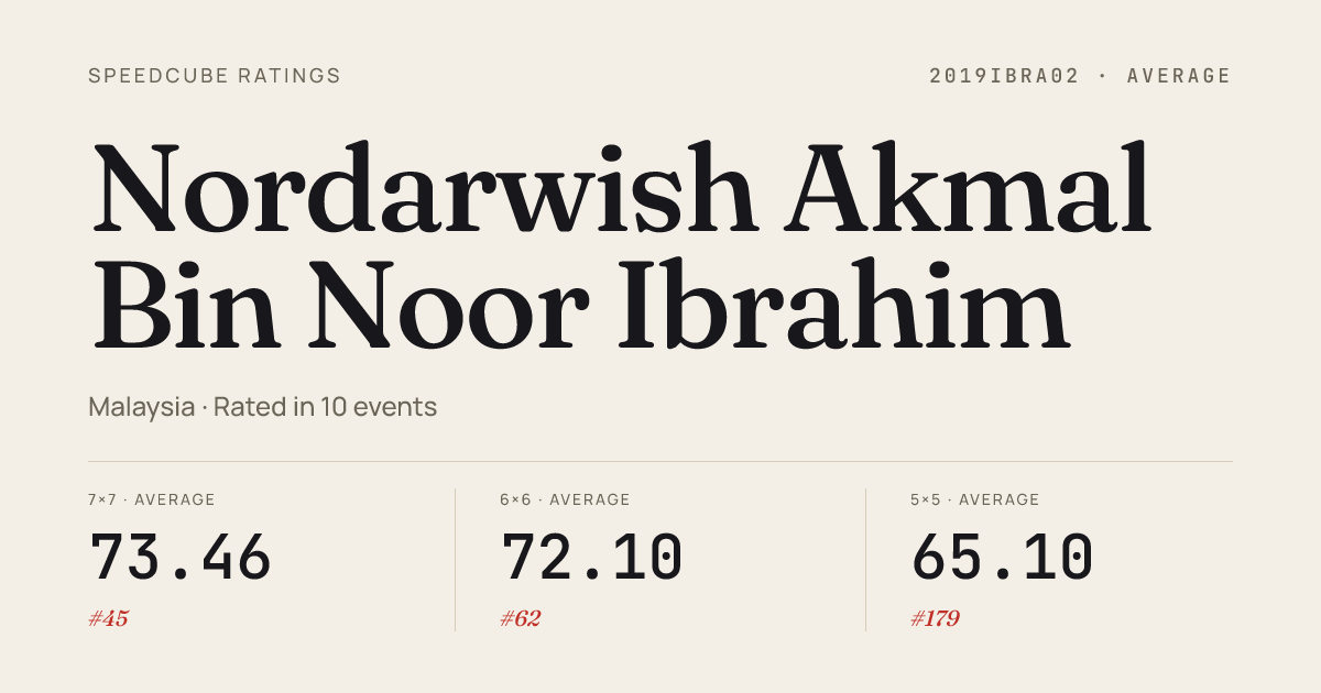 - Nov 2, 20253x3x3 Cube · FinalMalaysiaCubeChampionship2025 · national · 10th9.67