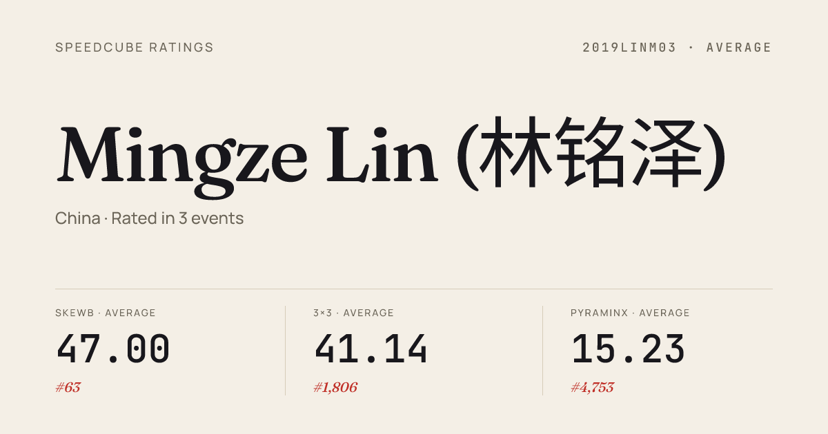 Mar 8, 2026Skewb · Round 2XianjuSpecial2026 · 5th3.38Mar 8, 2026Skewb · FinalXianjuSpecial2026 · 2nd2.71Jan 17, 20262x2x2 Cube · Round 1FuzhouOpen2026 · 28th4.62Jan 17, 20263x3x3 Cube · Round 1FuzhouOpen2026 · 13th9.02Jan 17, 2026Skewb · FinalFuzhouOpen2026 · 2nd3.14Jan 17, 2026Skewb · Round 1FuzhouOpen2026 · 1st2.56Sep 13, 20253x3x3 Cube · Round 1NingboAutumn2025 · 50th9.67Sep 13, 20253x3x3 Cube · Round 2NingboAutumn2025 · 56th10.09Sep 13, 2025Skewb · FinalNingboAutumn2025 · 2nd2.67Sep 13, 2025Skewb · Round 1NingboAutumn2025 · 2nd2.83Aug 24, 20253x3x3 Cube · Round 1JiangmenOpen2025 · 37th8.90Aug 24, 20253x3x3 Cube · Round 2JiangmenOpen2025 · 49th9.61Aug 24, 2025Skewb · Round 1JiangmenOpen2025 · 2nd2.43Aug 24, 2025Skewb · FinalJiangmenOpen2025 · 5th3.80Apr 26, 20253x3x3 Cube · Round 1NanchangSpring2025 · 40th9.41Apr 26, 20253x3x3 Cube · Round 2NanchangSpring2025 · 55th10.47Apr 26, 2025Skewb · Round 1NanchangSpring2025 · 8th3.62Apr 26, 2025Skewb · FinalNanchangSpring2025 · 2nd2.60Dec 15, 20243x3x3 Cube · Round 2HangzhouOpen2024 · 83rd10.64