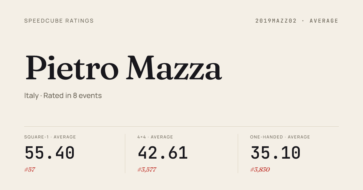 Dec 8, 20253x3x3 Cube · Round 2ItalianChampionship2025 · national · 82nd11.80Dec 8, 20253x3x3 One-Handed · Round 1ItalianChampionship2025 · national · 47th21.47Dec 8, 20254x4x4 Cube · Round 2ItalianChampionship2025 · national · 48th43.36Dec 8, 20254x4x4 Cube · Round 1ItalianChampionship2025 · national · 58th43.73Dec 8, 20255x5x5 Cube · Round 1ItalianChampionship2025 · national · 72nd1:31.93Dec 8, 2025Pyraminx · Round 1ItalianChampionship2025 · national · 118th10.80Dec 8, 2025Skewb · Round 1ItalianChampionship2025 · national · 103rd10.63Dec 8, 2025Square-1 · FinalItalianChampionship2025 · national · 2nd7.73Dec 8, 2025Square-1 · Round 1ItalianChampionship2025 · national · 3rd8.81Nov 3, 20242x2x2 Cube · FinalItalianChampionship2024 · national · 18th3.70Nov 3, 20242x2x2 Cube · Round 1ItalianChampionship2024 · national · 31st3.37Nov 3, 20242x2x2 Cube · Round 2ItalianChampionship2024 · national · 18th2.78Nov 3, 20243x3x3 Cube · Round 2ItalianChampionship2024 · national · 57th11.09Nov 3, 20243x3x3 Cube · Round 1ItalianChampionship2024 · national · 87th12.26Nov 3, 20243x3x3 Cube · Semi-FinalItalianChampionship2024 · national · 64th12.02Nov 3, 20243x3x3 One-Handed · Round 1ItalianChampionship2024 · national · 63rd23.90Nov 3, 20244x4x4 Cube · Round 2ItalianChampionship2024 · national · 45th44.61Nov 3, 20244x4x4 Cube · Round 1ItalianChampionship2024 · national · 54th45.38Nov 3, 20245x5x5 Cube · Round 1ItalianChampionship2024 · national · 83rd1:42.60Nov 3, 20246x6x6 Cube · Round 1ItalianChampionship2024 · national · 69th4:02.78