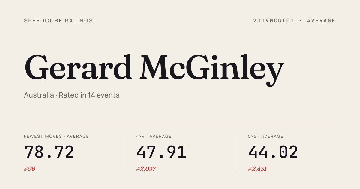 Jan 11, 20263x3x3 Blindfolded · Round 1AdelaideSummer2026 · 5th1:32.79Jan 11, 20263x3x3 One-Handed · FinalAdelaideSummer2026 · 11th21.85Jan 11, 20263x3x3 One-Handed · Round 1AdelaideSummer2026 · 8th21.59Jan 11, 20264x4x4 Cube · Combined FinalAdelaideSummer2026 · 5th37.09Jan 11, 20265x5x5 Cube · Combined FinalAdelaideSummer2026 · 7th1:18.17Jan 11, 20266x6x6 Cube · FinalAdelaideSummer2026 · 9th2:41.83Jan 11, 20267x7x7 Cube · FinalAdelaideSummer2026 · 6th4:22.60Jan 11, 2026Clock · Combined FinalAdelaideSummer2026 · 4th8.04Jan 11, 2026Pyraminx · FinalAdelaideSummer2026 · 10th6.43Jan 11, 2026Pyraminx · Round 1AdelaideSummer2026 · 4th5.30Jan 11, 2026Skewb · FinalAdelaideSummer2026 · 7th6.04Jan 11, 2026Skewb · Round 1AdelaideSummer2026 · 5th4.52Nov 30, 20252x2x2 Cube · Round 1MarinoMadness2025 · 1st2.32Nov 30, 20252x2x2 Cube · FinalMarinoMadness2025 · 1st1.95Nov 30, 20253x3x3 Cube · Round 1MarinoMadness2025 · 3rd9.69Nov 30, 20253x3x3 Cube · Round 2MarinoMadness2025 · 4th9.48Nov 30, 20253x3x3 Cube · FinalMarinoMadness2025 · 4th9.98Nov 30, 20253x3x3 Fewest Moves · FinalMarinoMadness2025 · 1st25.33Nov 30, 2025Megaminx · Combined FinalMarinoMadness2025 · 4th1:07.72