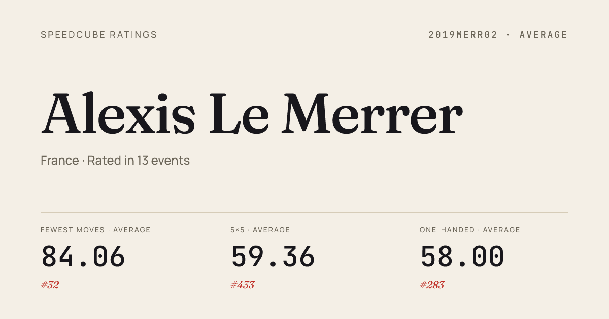 - Apr 6, 20263x3x3 Cube · Round 2FrenchChampionship2026 · national · 67th10.14