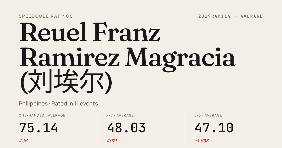 - Feb 22, 20263x3x3 Cube · Round 1SingaporeChampionship2026 · national · 30th8.93