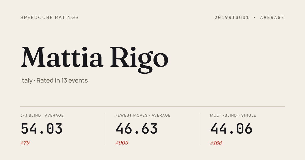 Apr 19, 20263x3x3 Cube · Round 2MinerbeOpen2026 · 13th10.64Apr 19, 20263x3x3 Blindfolded · FinalMinerbeOpen2026 · 1st27.21Apr 19, 20263x3x3 Blindfolded · Round 1MinerbeOpen2026 · 1st24.07Apr 19, 20264x4x4 Cube · Round 1MinerbeOpen2026 · 23rd53.94Apr 19, 20265x5x5 Cube · Round 1MinerbeOpen2026 · 17th1:55.27Apr 19, 20265x5x5 Cube · Round 2MinerbeOpen2026 · 17th1:42.64Apr 19, 20266x6x6 Cube · Round 1MinerbeOpen2026 · 16th3:36.10Apr 19, 20266x6x6 Cube · Round 2MinerbeOpen2026 · 16th3:24.39Apr 19, 20267x7x7 Cube · Round 1MinerbeOpen2026 · 16th6:26.42Apr 19, 2026Square-1 · Round 1MinerbeOpen2026 · 6th19.65Apr 19, 2026Square-1 · FinalMinerbeOpen2026 · 3rd15.88Mar 1, 20263x3x3 Cube · Round 2BozenOpen2026 · 13th10.01Mar 1, 20263x3x3 Cube · Round 1BozenOpen2026 · 22nd11.52Mar 1, 20263x3x3 Cube · FinalBozenOpen2026 · 18th10.92Mar 1, 20264x4x4 Cube · Round 1BozenOpen2026 · 31st59.34Mar 1, 20265x5x5 Cube · Round 2BozenOpen2026 · 25th1:37.06Mar 1, 20265x5x5 Cube · Round 1BozenOpen2026 · 26th1:45.14Mar 1, 20267x7x7 Cube · Round 1BozenOpen2026 · 24th5:53.97Feb 22, 20262x2x2 Cube · FinalBelliinZona2026 · 42nd5.98
