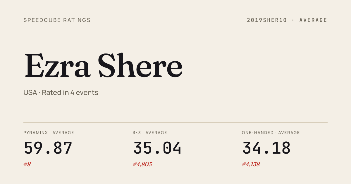 Aug 21, 20243x3x3 Cube · FinalIsraelChampionship2024 · national · 2nd7.71Aug 21, 20243x3x3 Cube · Round 1IsraelChampionship2024 · national · 7th8.41Aug 21, 20243x3x3 Cube · Round 2IsraelChampionship2024 · national · 10th8.67Aug 21, 20243x3x3 One-Handed · Round 1IsraelChampionship2024 · national · 26th18.33Aug 21, 2024Pyraminx · Round 1IsraelChampionship2024 · national · 1st1.62Aug 21, 2024Pyraminx · FinalIsraelChampionship2024 · national · 1st2.10Aug 21, 2024Pyraminx · Round 2IsraelChampionship2024 · national · 1st1.88Apr 28, 20243x3x3 One-Handed · Round 2CubicleDayOxford2024 · 4th15.67Apr 28, 20243x3x3 One-Handed · Round 1CubicleDayOxford2024 · 5th17.67Apr 28, 2024Pyraminx · Round 2CubicleDayOxford2024 · 4th3.46Apr 28, 2024Pyraminx · FinalCubicleDayOxford2024 · 3rd2.27Apr 28, 2024Pyraminx · Round 1CubicleDayOxford2024 · 1st2.07Apr 8, 20243x3x3 Cube · Round 1SolarEclipseinSycamore2024 · 6th8.14Apr 8, 20243x3x3 Cube · Round 2SolarEclipseinSycamore2024 · 9th8.25Apr 8, 20243x3x3 Cube · FinalSolarEclipseinSycamore2024 · 9th9.09Apr 8, 2024Pyraminx · Round 1SolarEclipseinSycamore2024 · 3rd2.24Apr 8, 2024Pyraminx · FinalSolarEclipseinSycamore2024 · 1st1.84Jan 7, 20243x3x3 Cube · FinalSolve4JusticeSouthfield2024 · 4th9.22Jan 7, 20243x3x3 Cube · Round 1Solve4JusticeSouthfield2024 · 3rd8.72