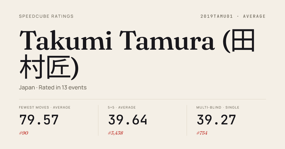 - Apr 12, 20263x3x3 Fewest Moves · FinalTokyoFMCSpring2026 · 9th23.67