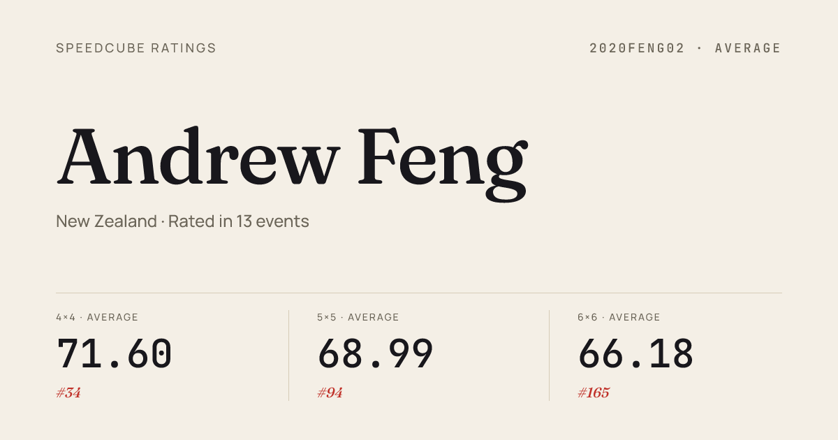 Jan 17, 20263x3x3 Blindfolded · Round 1ANewYearinAuckland2026 · 3rd1:11.10Jan 17, 20263x3x3 Blindfolded · FinalANewYearinAuckland2026 · 2nd47.44Jan 17, 20263x3x3 Fewest Moves · FinalANewYearinAuckland2026 · 5th37Jan 17, 20267x7x7 Cube · Round 1ANewYearinAuckland2026 · 5th3:09.37Jan 17, 20267x7x7 Cube · Combined FinalANewYearinAuckland2026 · 3rd2:43.35Jan 17, 2026Megaminx · Round 1ANewYearinAuckland2026 · 6th53.69Jan 17, 2026Megaminx · Combined FinalANewYearinAuckland2026 · 6th54.24Jan 17, 2026Pyraminx · FinalANewYearinAuckland2026 · 2nd2.83Jan 17, 2026Pyraminx · Round 1ANewYearinAuckland2026 · 7th3.57Jan 17, 2026Pyraminx · Round 2ANewYearinAuckland2026 · 7th3.67Jan 17, 2026Skewb · FinalANewYearinAuckland2026 · 7th5.48Jan 17, 2026Skewb · Round 1ANewYearinAuckland2026 · 9th6.79Jan 17, 2026Skewb · Round 2ANewYearinAuckland2026 · 3rd5.19Jan 17, 2026Square-1 · Round 1ANewYearinAuckland2026 · 5th12.61Jan 17, 2026Square-1 · Combined FinalANewYearinAuckland2026 · 7th16.91Dec 14, 20253x3x3 Cube · Round 1NewZealandNationals2025 · national · 1st6.34Dec 14, 20253x3x3 Cube · FinalNewZealandNationals2025 · national · 1st5.64Dec 14, 20253x3x3 Cube · Semi-FinalNewZealandNationals2025 · national · 2nd6.13Dec 14, 20253x3x3 Cube · Round 2NewZealandNationals2025 · national · 1st6.12