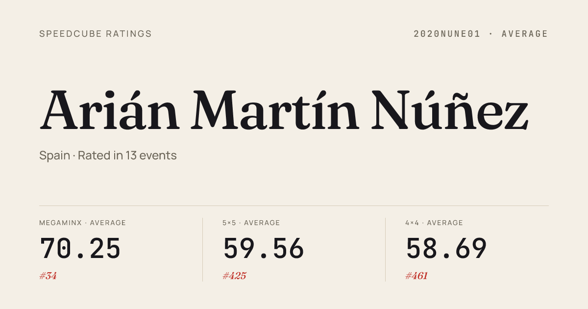 - Mar 29, 20263x3x3 Cube · Round 2CervantesCubeaAlcala2026 · 8th9.98