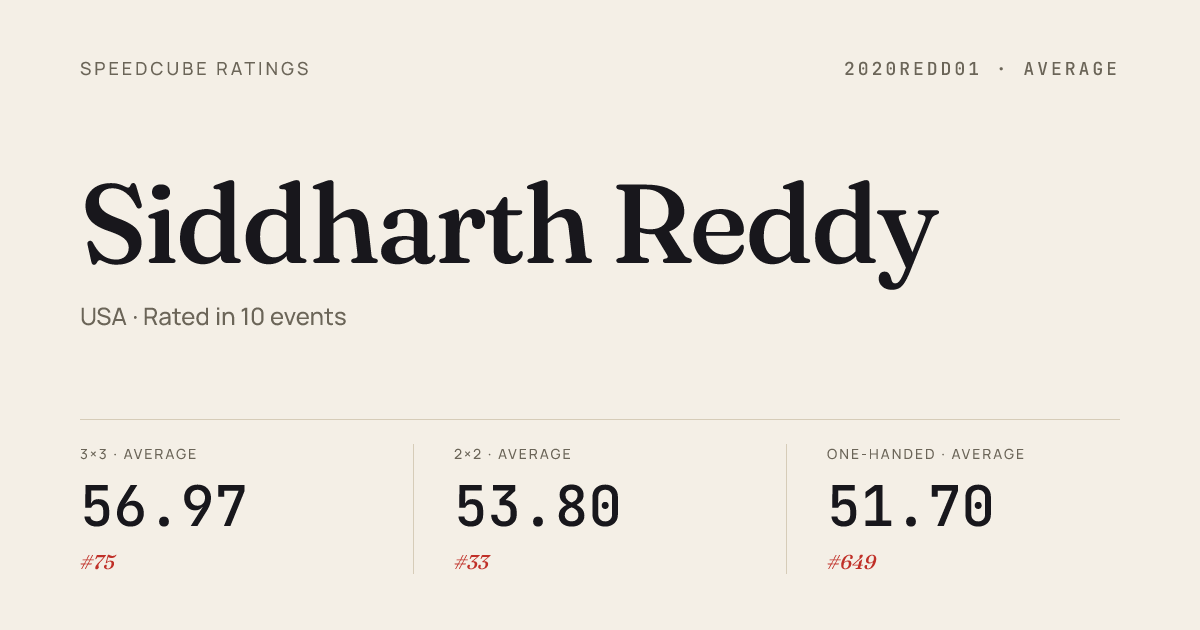 Mar 29, 20263x3x3 Cube · FinalDFWCubingSpring2026 · 1st4.69Mar 29, 20263x3x3 One-Handed · Round 2DFWCubingSpring2026 · 4th14.51Mar 29, 20263x3x3 One-Handed · FinalDFWCubingSpring2026 · 4th11.87Mar 29, 20263x3x3 One-Handed · Round 1DFWCubingSpring2026 · 5th14.97Mar 29, 20264x4x4 Cube · FinalDFWCubingSpring2026 · 5th33.26Mar 29, 20264x4x4 Cube · Round 1DFWCubingSpring2026 · 12th37.62Mar 29, 20264x4x4 Cube · Round 2DFWCubingSpring2026 · 8th35.44Mar 29, 2026Clock · FinalDFWCubingSpring2026 · 5th6.02Mar 29, 2026Pyraminx · FinalDFWCubingSpring2026 · 28th6.94Mar 7, 20262x2x2 Cube · Round 2TylerTwistsTurns2026 · 2nd1.78Mar 7, 20262x2x2 Cube · Round 1TylerTwistsTurns2026 · 1st1.56Mar 7, 20262x2x2 Cube · FinalTylerTwistsTurns2026 · 2nd1.80Mar 7, 20263x3x3 Cube · Round 1TylerTwistsTurns2026 · 2nd6.94Mar 7, 20263x3x3 Cube · Round 2TylerTwistsTurns2026 · 2nd6.13Mar 7, 20263x3x3 Cube · FinalTylerTwistsTurns2026 · 2nd7.09Mar 7, 20264x4x4 Cube · Round 1TylerTwistsTurns2026 · 4th35.91Mar 7, 20264x4x4 Cube · FinalTylerTwistsTurns2026 · 4th36.64Mar 7, 2026Pyraminx · FinalTylerTwistsTurns2026 · 4th5.55Mar 7, 2026Pyraminx · Round 1TylerTwistsTurns2026 · 6th6.52