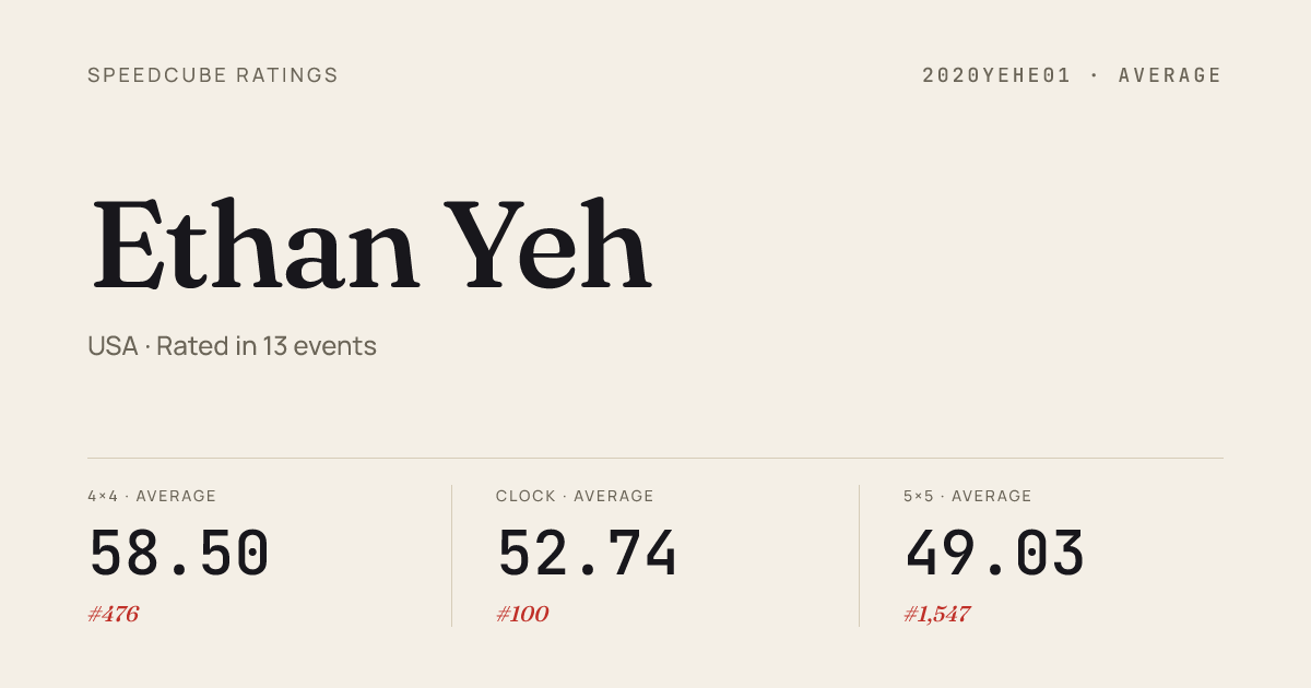 Mar 1, 2026Pyraminx · FinalUCSDMarchA2026 · 7th4.75Jan 24, 20262x2x2 Cube · Round 1AgouraWinter2026 · 23rd3.81Jan 24, 20263x3x3 Cube · Round 1AgouraWinter2026 · 6th7.89Jan 24, 20263x3x3 Cube · Round 2AgouraWinter2026 · 10th8.73Jan 24, 20263x3x3 Cube · FinalAgouraWinter2026 · 6th7.49Jan 24, 2026Clock · FinalAgouraWinter2026 · 3rd3.87Jan 24, 2026Clock · Round 2AgouraWinter2026 · 3rd3.83Jan 24, 2026Clock · Round 1AgouraWinter2026 · 7th5.44Jan 24, 2026Square-1 · Round 1AgouraWinter2026 · 5th11.32Jan 24, 2026Square-1 · FinalAgouraWinter2026 · 4th10.93Dec 13, 20253x3x3 Cube · Round 1TemeculaValleyWinter2025 · 8th8.08Dec 13, 20253x3x3 Cube · Round 2TemeculaValleyWinter2025 · 5th7.81Dec 13, 20253x3x3 Cube · FinalTemeculaValleyWinter2025 · 3rd7.26Dec 13, 20254x4x4 Cube · Round 1TemeculaValleyWinter2025 · 3rd27.37Dec 13, 20254x4x4 Cube · Round 2TemeculaValleyWinter2025 · 7th31.59Dec 13, 20256x6x6 Cube · Round 1TemeculaValleyWinter2025 · 11th2:30.58Dec 13, 2025Clock · Round 1TemeculaValleyWinter2025 · 3rd4.84Dec 13, 2025Clock · FinalTemeculaValleyWinter2025 · 15th4.08Dec 13, 2025Pyraminx · Round 1TemeculaValleyWinter2025 · 12th5.56
