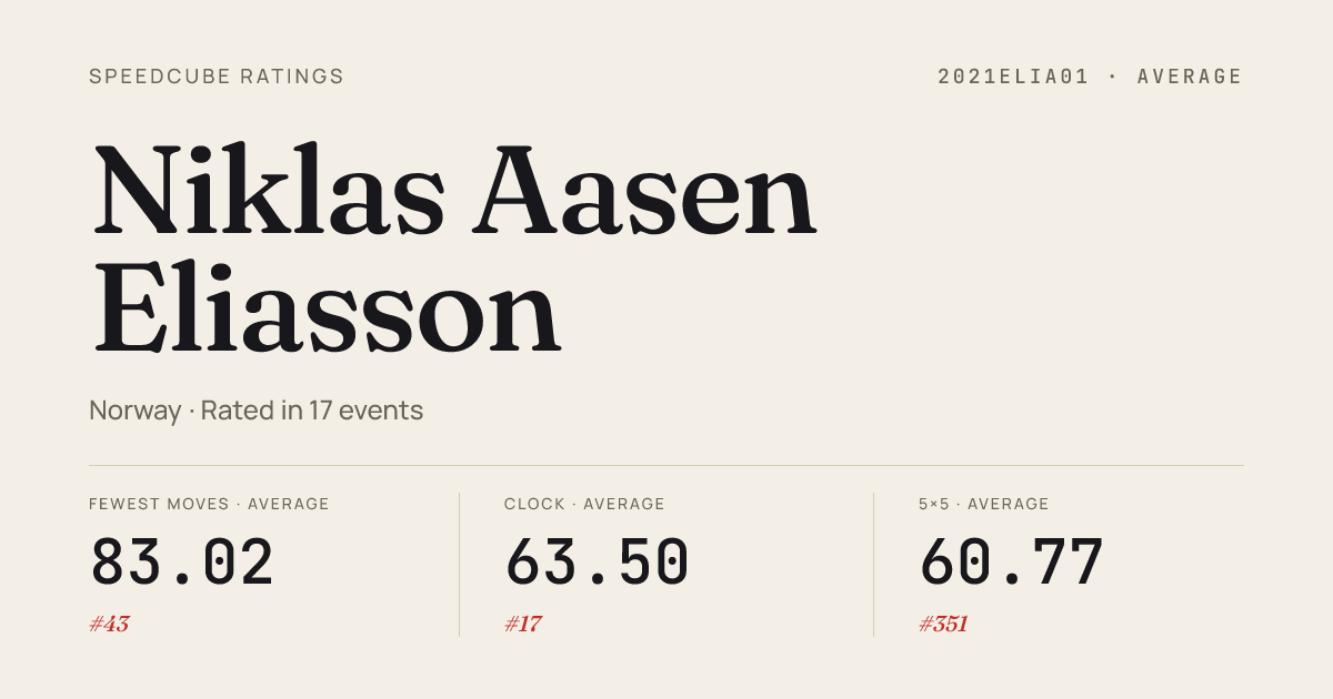 Mar 22, 20263x3x3 One-Handed · FinalBergenSpring2026 · 4th15.72Mar 22, 20263x3x3 One-Handed · Round 1BergenSpring2026 · 4th16.10Mar 22, 20264x4x4 Cube · Round 1BergenSpring2026 · 2nd30.00Mar 22, 20264x4x4 Cube · Round 2BergenSpring2026 · 3rd33.42Mar 22, 20264x4x4 Cube · FinalBergenSpring2026 · 2nd30.55Mar 22, 20265x5x5 Cube · Round 1BergenSpring2026 · 2nd56.32Mar 22, 20265x5x5 Cube · Round 2BergenSpring2026 · 2nd54.55Mar 22, 20265x5x5 Cube · FinalBergenSpring2026 · 2nd55.28Mar 22, 20266x6x6 Cube · FinalBergenSpring2026 · 3rd1:53.28Mar 22, 20266x6x6 Cube · Round 1BergenSpring2026 · 2nd1:43.54Mar 22, 2026Megaminx · Combined FinalBergenSpring2026 · 2nd47.53Mar 22, 2026Square-1 · Combined FinalBergenSpring2026 · 1st11.43Mar 15, 20263x3x3 Fewest Moves · Round 1FMCNorway2026 · 2nd22.33Mar 15, 20263x3x3 Fewest Moves · Round 2FMCNorway2026 · 1st23.00Mar 15, 20263x3x3 Fewest Moves · FinalFMCNorway2026 · 2nd22.67Mar 8, 20262x2x2 Cube · Round 1SogndalSpring2026 · 2nd1.89Mar 8, 20262x2x2 Cube · FinalSogndalSpring2026 · 2nd1.67Mar 8, 20263x3x3 Cube · Round 1SogndalSpring2026 · 2nd7.42Mar 8, 20263x3x3 Cube · FinalSogndalSpring2026 · 2nd7.92