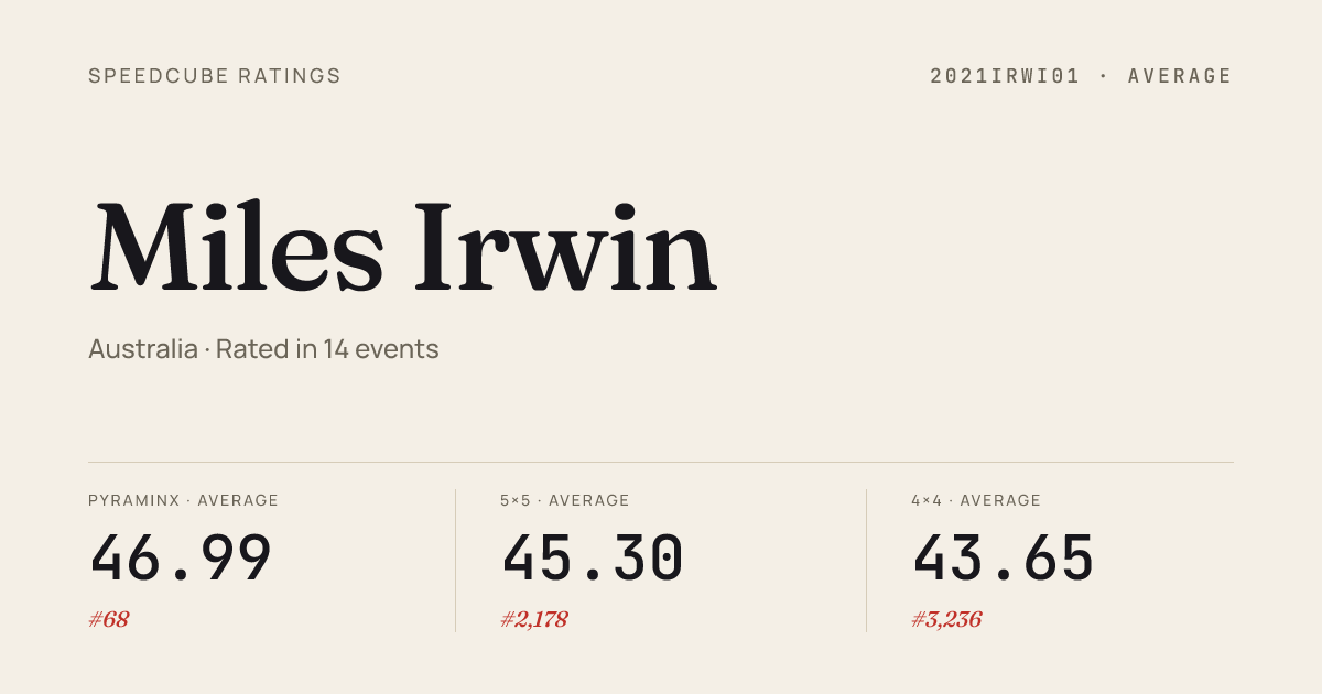 Apr 19, 20263x3x3 Fewest Moves · FinalSolvinginSale2026 · 14th39Apr 19, 20263x3x3 One-Handed · Combined FinalSolvinginSale2026 · 25th24.21Apr 19, 20264x4x4 Cube · Combined FinalSolvinginSale2026 · 19th41.36Apr 19, 20265x5x5 Cube · Combined FinalSolvinginSale2026 · 12th1:09.98Apr 19, 2026Megaminx · Combined FinalSolvinginSale2026 · 28th1:34.39Apr 19, 2026Pyraminx · Round 1SolvinginSale2026 · 1st2.55Apr 19, 2026Pyraminx · FinalSolvinginSale2026 · 1st2.19Apr 19, 2026Pyraminx · Round 2SolvinginSale2026 · 1st2.20Apr 19, 2026Skewb · Round 1SolvinginSale2026 · 32nd8.48Apr 12, 20262x2x2 Cube · Round 1Orange2026 · 8th3.34Apr 12, 20262x2x2 Cube · FinalOrange2026 · 3rd3.11Apr 12, 20263x3x3 Cube · Round 2Orange2026 · 9th10.82Apr 12, 20263x3x3 Cube · Round 1Orange2026 · 6th10.67Apr 12, 20263x3x3 Cube · FinalOrange2026 · 6th10.78Apr 12, 20263x3x3 One-Handed · Round 1Orange2026 · 10th25.90Apr 12, 20263x3x3 One-Handed · Combined FinalOrange2026 · 8th24.01Apr 12, 20265x5x5 Cube · Combined FinalOrange2026 · 4th1:16.24Apr 12, 2026Clock · Round 1Orange2026 · 4th6.94Apr 12, 2026Clock · Combined FinalOrange2026 · 3rd5.85