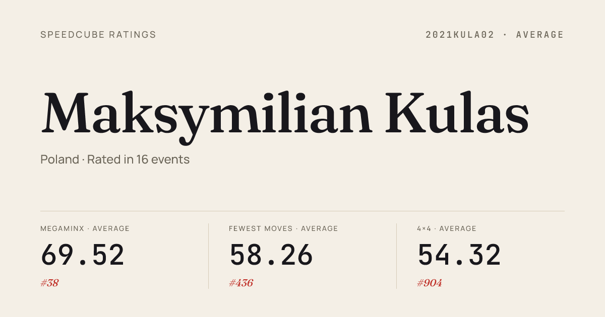 Apr 12, 20263x3x3 Cube · Round 2MielecCubingDays2026 · 7th7.84Apr 12, 20263x3x3 One-Handed · Round 1MielecCubingDays2026 · 10th15.77Apr 12, 20263x3x3 One-Handed · FinalMielecCubingDays2026 · 10th15.94Apr 12, 20263x3x3 One-Handed · Round 2MielecCubingDays2026 · 7th14.24Apr 12, 20264x4x4 Cube · Round 1MielecCubingDays2026 · 11th34.14Apr 12, 20264x4x4 Cube · FinalMielecCubingDays2026 · 12th37.25Apr 12, 20265x5x5 Cube · FinalMielecCubingDays2026 · 7th58.30Apr 12, 20265x5x5 Cube · Round 1MielecCubingDays2026 · 10th59.94Apr 12, 2026Clock · FinalMielecCubingDays2026 · 12th4.97Apr 12, 2026Clock · Round 1MielecCubingDays2026 · 2nd5.20Apr 12, 2026Megaminx · Round 1MielecCubingDays2026 · 4th35.14Apr 12, 2026Megaminx · FinalMielecCubingDays2026 · 5th34.73Apr 12, 2026Megaminx · Round 2MielecCubingDays2026 · 5th36.20Apr 12, 2026Pyraminx · Round 1MielecCubingDays2026 · 3rd2.04Apr 12, 2026Pyraminx · FinalMielecCubingDays2026 · 3rd2.63Apr 12, 2026Skewb · FinalMielecCubingDays2026 · 7th3.07Apr 12, 2026Skewb · Round 1MielecCubingDays2026 · 6th3.45Apr 12, 2026Skewb · Round 2MielecCubingDays2026 · 4th2.49Apr 12, 2026Square-1 · Combined FinalMielecCubingDays2026 · 4th11.55
