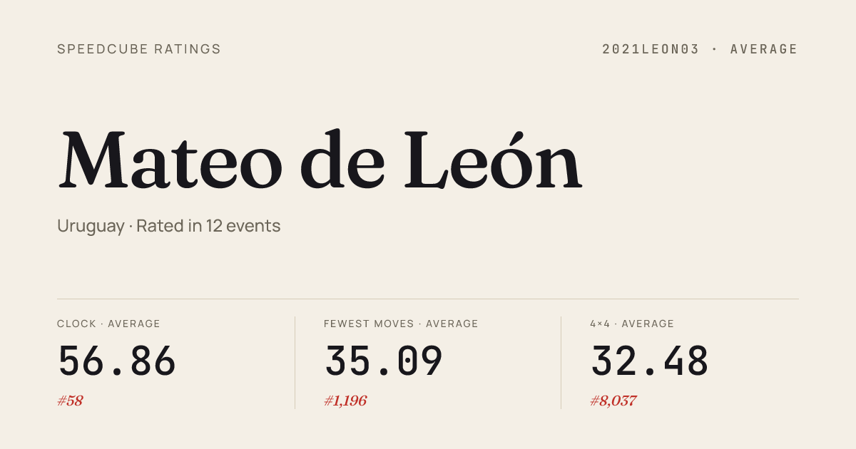 Jan 31, 2026Clock · Combined FinalClaretOpenMontevideo2026 · 1st3.91Jan 31, 2026Pyraminx · Combined FinalClaretOpenMontevideo2026 · 5th5.34Mar 23, 20252x2x2 Cube · Combined FinalAltavistaMindblowing2025 · 4th5.03Mar 23, 20253x3x3 Cube · FinalAltavistaMindblowing2025 · 6th12.86Mar 23, 20253x3x3 Fewest Moves · FinalAltavistaMindblowing2025 · 4th54.33Mar 23, 2025Skewb · Round 1AltavistaMindblowing2025 · 3rd6.87Mar 23, 2025Skewb · FinalAltavistaMindblowing2025 · 2nd5.72Mar 16, 20252x2x2 Cube · Round 1MontevideoOClock2025 · 15th6.91Mar 16, 20253x3x3 Cube · Round 1MontevideoOClock2025 · 11th14.10Mar 16, 20254x4x4 Cube · Combined FinalMontevideoOClock2025 · 7th50.42Mar 16, 20255x5x5 Cube · Combined FinalMontevideoOClock2025 · 9th1:57.29Mar 16, 2025Clock · Round 1MontevideoOClock2025 · 1st4.10Mar 16, 2025Clock · FinalMontevideoOClock2025 · 8th5.54Mar 16, 2025Megaminx · Combined FinalMontevideoOClock2025 · 9th2:26.72Mar 16, 2025Pyraminx · Combined FinalMontevideoOClock2025 · 3rd4.29Mar 16, 2025Skewb · FinalMontevideoOClock2025 · 8th4.66Mar 16, 2025Skewb · Round 1MontevideoOClock2025 · 6th5.98Jan 26, 20252x2x2 Cube · Round 2AltavistaSideEvents2025 · 5th4.78Jan 26, 20252x2x2 Cube · FinalAltavistaSideEvents2025 · 7th6.13Jan 26, 20252x2x2 Cube · Round 1AltavistaSideEvents2025 · 11th6.65