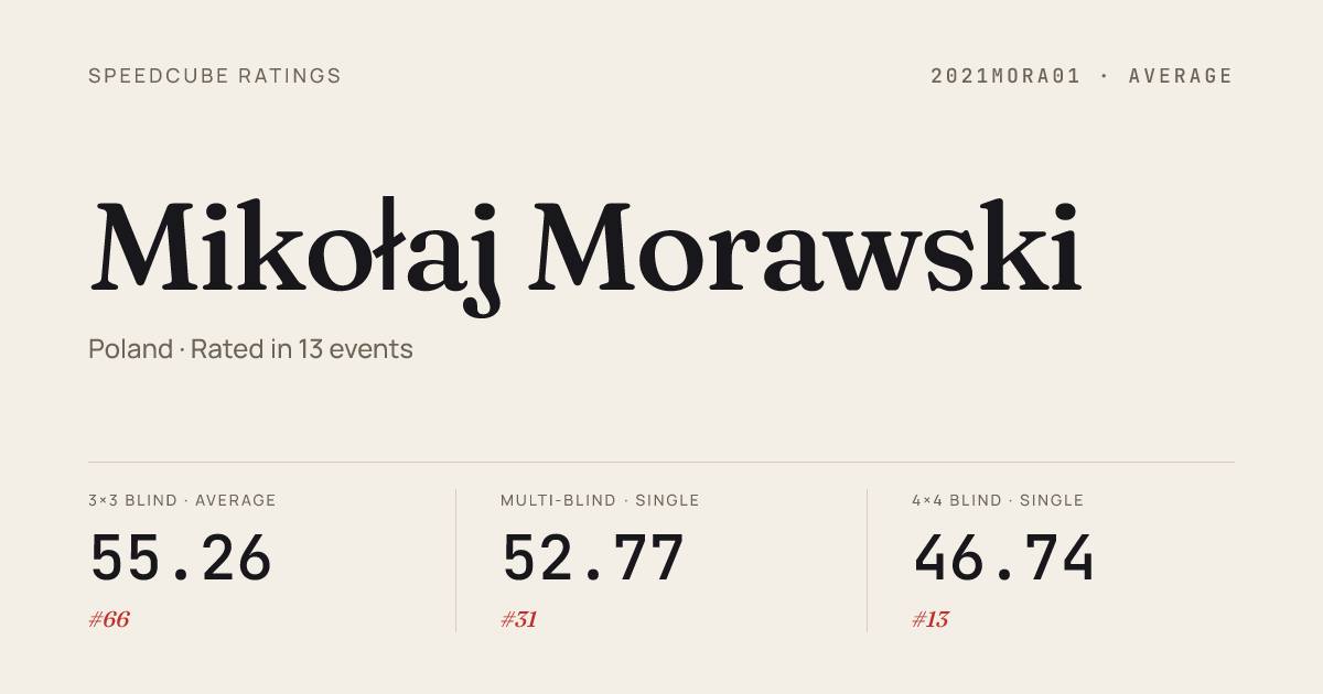 Apr 19, 20263x3x3 Cube · FinalCubeFactoryLeagueJezow2026 · 33rd12.52Apr 19, 20263x3x3 Cube · Round 2CubeFactoryLeagueJezow2026 · 34th12.44Apr 19, 20263x3x3 Blindfolded · Round 1CubeFactoryLeagueJezow2026 · 3rd26.72Apr 19, 20263x3x3 Blindfolded · FinalCubeFactoryLeagueJezow2026 · 3rd35.11Apr 19, 20264x4x4 Cube · Round 1CubeFactoryLeagueJezow2026 · 28th46.78Apr 19, 2026Megaminx · Round 1CubeFactoryLeagueJezow2026 · 35th1:31.14Apr 19, 2026Pyraminx · Round 1CubeFactoryLeagueJezow2026 · 29th6.67Apr 19, 2026Skewb · Round 1CubeFactoryLeagueJezow2026 · 28th7.27Apr 19, 2026Square-1 · Round 1CubeFactoryLeagueJezow2026 · 16th29.79Mar 28, 20265x5x5 Blindfolded · FinalCichaSobotawLodzi2026 · 1st3:33.27Mar 15, 20262x2x2 Cube · Round 1CubeFactoryLeagueRogow2026 · 17th3.19Mar 15, 20263x3x3 Cube · Round 1CubeFactoryLeagueRogow2026 · 48th13.71Mar 15, 20263x3x3 Cube · Round 2CubeFactoryLeagueRogow2026 · 45th13.34Mar 15, 20263x3x3 Blindfolded · Round 1CubeFactoryLeagueRogow2026 · 4th25.99Mar 15, 20263x3x3 Blindfolded · FinalCubeFactoryLeagueRogow2026 · 3rd18.76Mar 15, 20263x3x3 One-Handed · Round 1CubeFactoryLeagueRogow2026 · 28th23.94Mar 15, 20264x4x4 Cube · Round 1CubeFactoryLeagueRogow2026 · 23rd41.63Mar 15, 2026Megaminx · Round 1CubeFactoryLeagueRogow2026 · 39th1:30.28Mar 15, 2026Pyraminx · Round 1CubeFactoryLeagueRogow2026 · 31st6.45Mar 15, 2026Skewb · Round 1CubeFactoryLeagueRogow2026 · 34th7.19