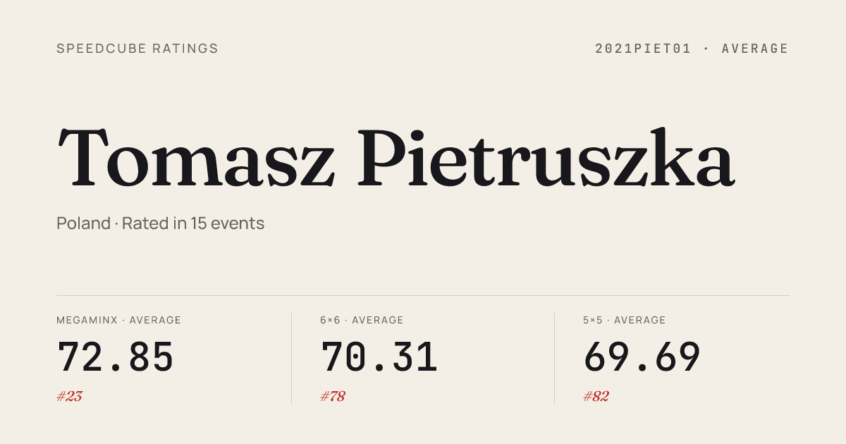Apr 12, 20263x3x3 Cube · Round 2MielecCubingDays2026 · 8th8.18Apr 12, 20263x3x3 One-Handed · Round 2MielecCubingDays2026 · 13th17.11Apr 12, 20263x3x3 One-Handed · Round 1MielecCubingDays2026 · 9th15.77Apr 12, 20264x4x4 Cube · Round 1MielecCubingDays2026 · 4th28.27Apr 12, 20264x4x4 Cube · FinalMielecCubingDays2026 · 4th28.92Apr 12, 20265x5x5 Cube · FinalMielecCubingDays2026 · 1st49.28Apr 12, 20265x5x5 Cube · Round 1MielecCubingDays2026 · 1st48.31Apr 12, 2026Clock · FinalMielecCubingDays2026 · 3rd4.70Apr 12, 2026Clock · Round 1MielecCubingDays2026 · 8th6.16Apr 12, 2026Megaminx · Round 2MielecCubingDays2026 · 1st31.76Apr 12, 2026Megaminx · FinalMielecCubingDays2026 · 2nd33.38Apr 12, 2026Megaminx · Round 1MielecCubingDays2026 · 1st31.87Apr 12, 2026Pyraminx · FinalMielecCubingDays2026 · 12th5.75Apr 12, 2026Pyraminx · Round 1MielecCubingDays2026 · 5th2.29Apr 12, 2026Skewb · Round 1MielecCubingDays2026 · 2nd2.24Apr 12, 2026Skewb · FinalMielecCubingDays2026 · 2nd2.14Apr 12, 2026Skewb · Round 2MielecCubingDays2026 · 2nd2.25Apr 12, 2026Square-1 · Combined FinalMielecCubingDays2026 · 2nd10.15Mar 22, 20262x2x2 Cube · Round 2RuzomberokOpen2026 · 3rd1.70