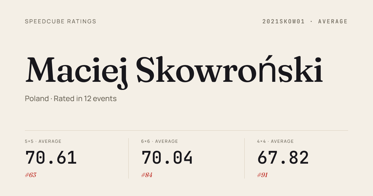 Nov 16, 20254x4x4 Cube · Round 1PolishChampionship2025 · national · 5th27.15Nov 16, 20255x5x5 Cube · FinalPolishChampionship2025 · national · 4th48.78Nov 16, 20255x5x5 Cube · Round 1PolishChampionship2025 · national · 2nd48.19Nov 16, 20256x6x6 Cube · Combined FinalPolishChampionship2025 · national · 6th1:32.35Nov 16, 20257x7x7 Cube · Combined FinalPolishChampionship2025 · national · 5th2:21.42Nov 16, 2025Clock · Round 1PolishChampionship2025 · national · 31st5.59Jul 6, 20253x3x3 Cube · Round 2WC2025 · world · 400th9.11Jul 6, 20253x3x3 Cube · Round 1WC2025 · world · 420th9.12Jul 6, 20254x4x4 Cube · Round 1WC2025 · world · 49th27.81Jul 6, 20254x4x4 Cube · Round 2WC2025 · world · 64th28.73Jul 6, 20255x5x5 Cube · Round 1WC2025 · world · 40th49.81Jul 6, 20255x5x5 Cube · Round 2WC2025 · world · 42nd49.36Jul 6, 20256x6x6 Cube · Round 1WC2025 · world · 66th1:38.38Jul 6, 20256x6x6 Cube · Round 2WC2025 · world · 40th1:32.44Jul 6, 20257x7x7 Cube · Round 1WC2025 · world · 54th2:30.28Jul 6, 20257x7x7 Cube · Round 2WC2025 · world · 63rd2:37.25Jul 6, 2025Clock · Round 1WC2025 · world · 907th7.15Jul 6, 2025Megaminx · Round 1WC2025 · world · 112th48.11Nov 10, 20243x3x3 Cube · Round 1PolishChampionship2024 · national · 26th8.06Nov 10, 20243x3x3 Cube · Round 2PolishChampionship2024 · national · 17th7.64