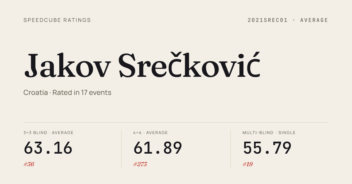 Mar 8, 20263x3x3 Cube · FinalMariborOpen2026 · 9th9.74Mar 8, 20263x3x3 Blindfolded · FinalMariborOpen2026 · 1st25.59Mar 8, 20263x3x3 One-Handed · FinalMariborOpen2026 · 3rd15.05Mar 8, 20263x3x3 One-Handed · Round 1MariborOpen2026 · 8th18.44Mar 8, 20264x4x4 Cube · FinalMariborOpen2026 · 1st28.24Mar 8, 20264x4x4 Cube · Round 1MariborOpen2026 · 2nd30.82Mar 8, 20265x5x5 Cube · FinalMariborOpen2026 · 2nd57.45Mar 8, 20265x5x5 Cube · Round 1MariborOpen2026 · 3rd1:02.36Mar 8, 20266x6x6 Cube · Combined FinalMariborOpen2026 · 5th2:05.59Mar 8, 20267x7x7 Cube · Combined FinalMariborOpen2026 · 7th3:42.77Mar 8, 2026Clock · FinalMariborOpen2026 · 1st5.55Mar 8, 2026Clock · Round 1MariborOpen2026 · 3rd6.50Mar 8, 2026Megaminx · Combined FinalMariborOpen2026 · 13th1:06.10Mar 8, 2026Pyraminx · FinalMariborOpen2026 · 2nd3.44Mar 8, 2026Pyraminx · Round 1MariborOpen2026 · 2nd3.61Mar 8, 2026Skewb · Round 1MariborOpen2026 · 14th6.41Mar 8, 2026Skewb · FinalMariborOpen2026 · 13th6.22Mar 8, 2026Square-1 · Round 1MariborOpen2026 · 4th12.37Mar 8, 2026Square-1 · FinalMariborOpen2026 · 5th14.77