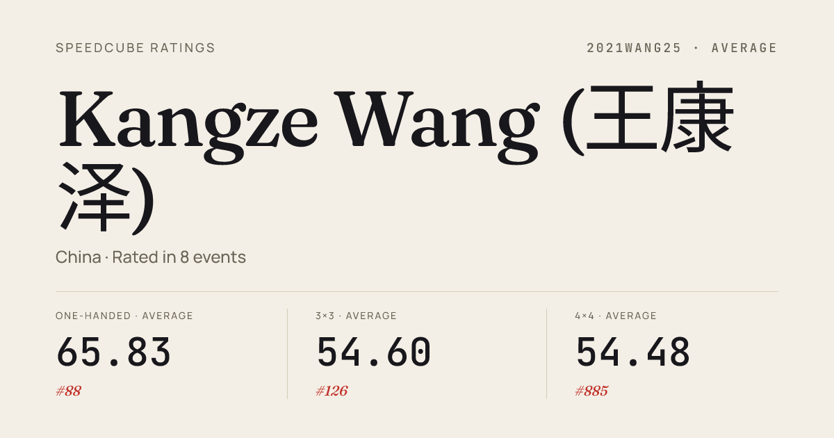 Jan 11, 20262x2x2 Cube · FinalBeijingWinter2026 · 11th2.79Jan 11, 20262x2x2 Cube · Round 1BeijingWinter2026 · 12th3.08Jan 11, 20263x3x3 Cube · Semi-FinalBeijingWinter2026 · 13th6.80Jan 11, 20263x3x3 Cube · Round 1BeijingWinter2026 · 17th7.46Jan 11, 20263x3x3 Cube · Round 2BeijingWinter2026 · 16th7.53Jan 11, 20264x4x4 Cube · Round 1BeijingWinter2026 · 21st34.51Jan 11, 20265x5x5 Cube · Round 1BeijingWinter2026 · 33rd1:17.73Dec 27, 20252x2x2 Cube · Round 1ZhengzhouZest2025 · 16th2.92Dec 27, 20252x2x2 Cube · FinalZhengzhouZest2025 · 14th2.72Dec 27, 20253x3x3 Cube · Round 1ZhengzhouZest2025 · 28th8.17Dec 27, 20253x3x3 Cube · Round 2ZhengzhouZest2025 · 14th6.80Dec 27, 20253x3x3 One-Handed · Round 1ZhengzhouZest2025 · 5th12.13Dec 27, 20253x3x3 One-Handed · FinalZhengzhouZest2025 · 4th11.11Dec 27, 2025Pyraminx · Round 1ZhengzhouZest2025 · 37th5.98Dec 27, 2025Skewb · Round 1ZhengzhouZest2025 · 52nd8.43May 18, 20253x3x3 One-Handed · Combined FinalUSMPenangCube2025 · 1st11.74Apr 5, 20252x2x2 Cube · Round 1XianCherryBlossom2025 · 23rd2.55Apr 5, 20253x3x3 Cube · Round 1XianCherryBlossom2025 · 19th7.04Apr 5, 20253x3x3 Cube · Round 2XianCherryBlossom2025 · 37th8.71