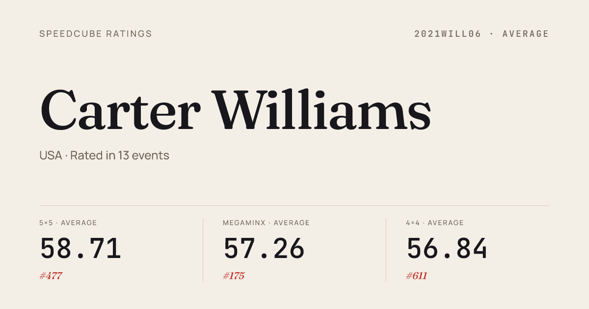 Apr 5, 20264x4x4 Cube · Combined FinalNYUSpring2026 · 4th30.51Apr 5, 20265x5x5 Cube · Combined FinalNYUSpring2026 · 4th57.50Apr 4, 20263x3x3 Cube · Round 1PBsinPalisadesSpring2026 · 11th8.90Apr 4, 20263x3x3 Cube · FinalPBsinPalisadesSpring2026 · 10th8.41Apr 4, 20263x3x3 Cube · Round 2PBsinPalisadesSpring2026 · 13th8.78Apr 4, 20264x4x4 Cube · FinalPBsinPalisadesSpring2026 · 9th33.61Apr 4, 20264x4x4 Cube · Round 1PBsinPalisadesSpring2026 · 6th31.45Apr 4, 2026Clock · FinalPBsinPalisadesSpring2026 · 4th4.09Apr 4, 2026Clock · Round 1PBsinPalisadesSpring2026 · 2nd4.06Apr 4, 2026Clock · Round 2PBsinPalisadesSpring2026 · 2nd3.66Apr 4, 2026Pyraminx · Round 2PBsinPalisadesSpring2026 · 25th5.33Apr 4, 2026Pyraminx · Round 1PBsinPalisadesSpring2026 · 30th6.80Feb 21, 20263x3x3 Cube · Round 1PBsinPalisadesOpen2026 · 12th8.39Feb 21, 20263x3x3 Cube · Round 2PBsinPalisadesOpen2026 · 17th8.52Feb 21, 20264x4x4 Cube · Round 1PBsinPalisadesOpen2026 · 8th32.29Feb 21, 20264x4x4 Cube · FinalPBsinPalisadesOpen2026 · 11th33.33Feb 21, 2026Clock · Round 1PBsinPalisadesOpen2026 · 5th4.08Feb 21, 2026Clock · FinalPBsinPalisadesOpen2026 · 6th4.46Feb 21, 2026Megaminx · Combined FinalPBsinPalisadesOpen2026 · 4th40.64