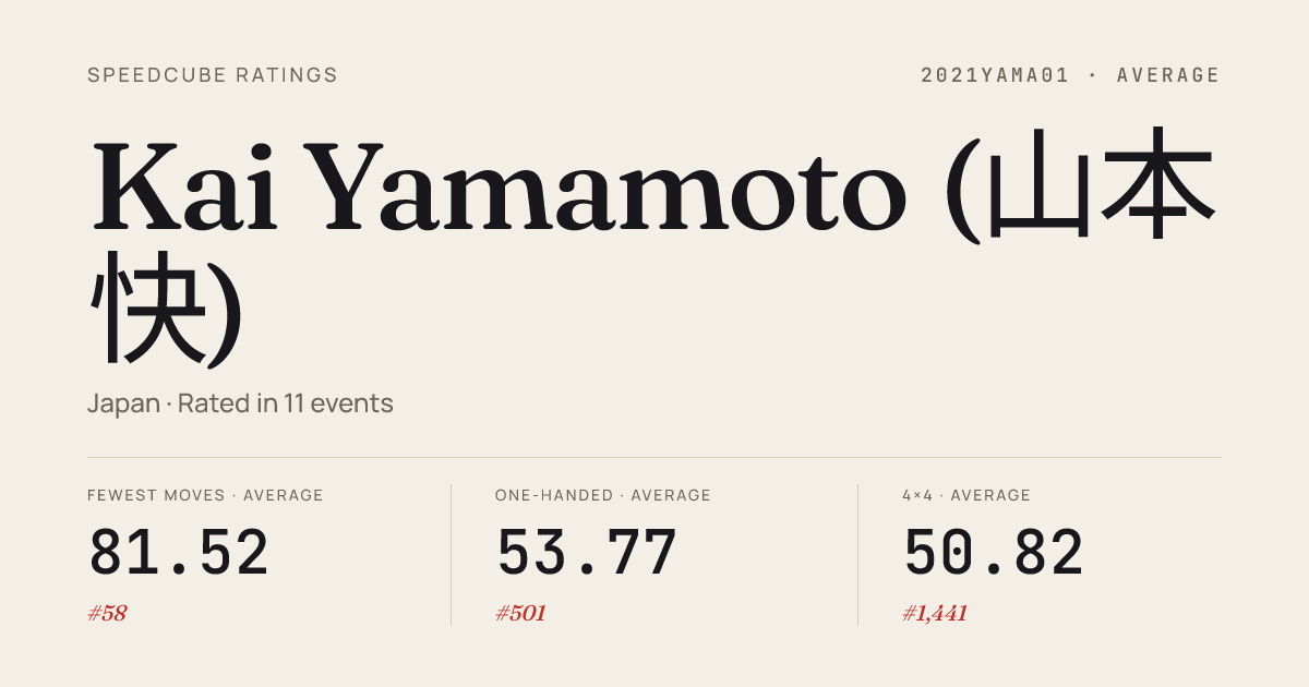 Apr 11, 2026Skewb · Round 1OtsuBiwakoSpring2026 · 15th6.65Apr 5, 20262x2x2 Cube · Round 1TokyoSpring2026 · 8th2.86Apr 5, 20262x2x2 Cube · FinalTokyoSpring2026 · 7th2.72Apr 5, 20263x3x3 Cube · Round 1TokyoSpring2026 · 32nd11.40Apr 5, 20263x3x3 Cube · Round 2TokyoSpring2026 · 28th10.60Apr 5, 2026Pyraminx · FinalTokyoSpring2026 · 7th5.16Apr 5, 2026Pyraminx · Round 1TokyoSpring2026 · 9th5.40Mar 29, 20263x3x3 Blindfolded · Round 1TokyoBLDSpring2026 · 21st53.84Mar 29, 20263x3x3 Blindfolded · FinalTokyoBLDSpring2026 · 17th44.64Mar 29, 20263x3x3 Blindfolded · Round 2TokyoBLDSpring2026 · 19th51.64Mar 29, 20264x4x4 Blindfolded · FinalTokyoBLDSpring2026 · 8th4:21.22Mar 29, 20265x5x5 Blindfolded · FinalTokyoBLDSpring2026 · 8th11:21.00Mar 22, 20263x3x3 Cube · Round 1KatanoSpring2026 · 51st12.28Mar 22, 20263x3x3 One-Handed · FinalKatanoSpring2026 · 14th15.76Mar 22, 20263x3x3 One-Handed · Round 1KatanoSpring2026 · 7th13.25Mar 22, 20264x4x4 Cube · Round 1KatanoSpring2026 · 18th36.27Mar 22, 20265x5x5 Cube · Round 1KatanoSpring2026 · 21st1:09.70Mar 22, 20266x6x6 Cube · Round 1KatanoSpring2026 · 18th2:02.59Mar 22, 2026Pyraminx · Round 1KatanoSpring2026 · 28th6.69
