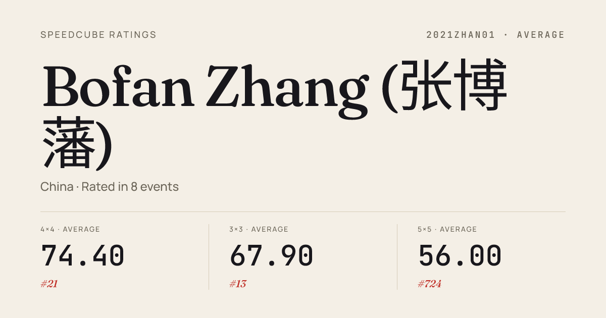 Nov 16, 20254x4x4 Cube · Round 1XuzhouOpen2025 · 1st22.50Nov 16, 20254x4x4 Cube · FinalXuzhouOpen2025 · 1st22.58Aug 24, 20252x2x2 Cube · FinalJiangmenOpen2025 · 9th2.22Aug 24, 20252x2x2 Cube · Round 1JiangmenOpen2025 · 6th1.76Aug 24, 20253x3x3 Cube · Round 1JiangmenOpen2025 · 2nd5.10Aug 24, 20253x3x3 Cube · FinalJiangmenOpen2025 · 2nd5.04Aug 24, 20253x3x3 Cube · Round 2JiangmenOpen2025 · 2nd5.19Aug 24, 20254x4x4 Cube · Round 1JiangmenOpen2025 · 3rd24.81Aug 24, 20254x4x4 Cube · FinalJiangmenOpen2025 · 2nd25.81Aug 10, 20252x2x2 Cube · Round 1ZiboOpen2025 · 6th1.73Aug 10, 20252x2x2 Cube · FinalZiboOpen2025 · 4th1.54Aug 10, 20253x3x3 Cube · Round 2ZiboOpen2025 · 3rd5.32Aug 10, 20253x3x3 Cube · Round 1ZiboOpen2025 · 7th5.78Aug 10, 20253x3x3 Cube · FinalZiboOpen2025 · 3rd5.16Aug 10, 2025Pyraminx · FinalZiboOpen2025 · 10th3.04Aug 10, 2025Pyraminx · Round 1ZiboOpen2025 · 25th4.34Jul 26, 20252x2x2 Cube · FinalTaizhouOpen2025 · 4th1.70Jul 26, 20252x2x2 Cube · Round 1TaizhouOpen2025 · 3rd1.58Jul 26, 20253x3x3 Cube · Round 2TaizhouOpen2025 · 6th5.50