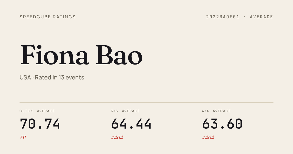 Mar 28, 20265x5x5 Cube · Combined FinalWilliamsburgOpenSpring2026 · 1st55.03Mar 28, 2026Clock · FinalWilliamsburgOpenSpring2026 · 2nd3.56Mar 28, 2026Clock · Round 1WilliamsburgOpenSpring2026 · 1st3.00Mar 28, 2026Square-1 · FinalWilliamsburgOpenSpring2026 · 4th13.31Mar 28, 2026Square-1 · Round 1WilliamsburgOpenSpring2026 · 3rd13.39Mar 15, 20262x2x2 Cube · Round 1TJHSSTWinter2026 · 6th2.67Mar 15, 20262x2x2 Cube · FinalTJHSSTWinter2026 · 4th2.32Mar 15, 20263x3x3 Cube · FinalTJHSSTWinter2026 · 2nd7.68Mar 15, 20263x3x3 Cube · Round 1TJHSSTWinter2026 · 6th8.11Mar 15, 20263x3x3 Cube · Round 2TJHSSTWinter2026 · 20th9.44Mar 15, 20263x3x3 One-Handed · Combined FinalTJHSSTWinter2026 · 11th17.49Mar 15, 20264x4x4 Cube · Combined FinalTJHSSTWinter2026 · 1st28.54Mar 15, 20265x5x5 Cube · Combined FinalTJHSSTWinter2026 · 1st51.56Mar 15, 2026Clock · FinalTJHSSTWinter2026 · 1st3.33Mar 15, 2026Clock · Round 1TJHSSTWinter2026 · 1st2.91Feb 14, 20263x3x3 Cube · FinalUMBCWinter2026 · 13th10.17Feb 14, 20263x3x3 Cube · Round 2UMBCWinter2026 · 2nd8.43Feb 14, 20263x3x3 Cube · Round 1UMBCWinter2026 · 4th8.76Feb 14, 20263x3x3 One-Handed · Combined FinalUMBCWinter2026 · 7th17.45Feb 14, 20265x5x5 Cube · Combined FinalUMBCWinter2026 · 2nd54.97