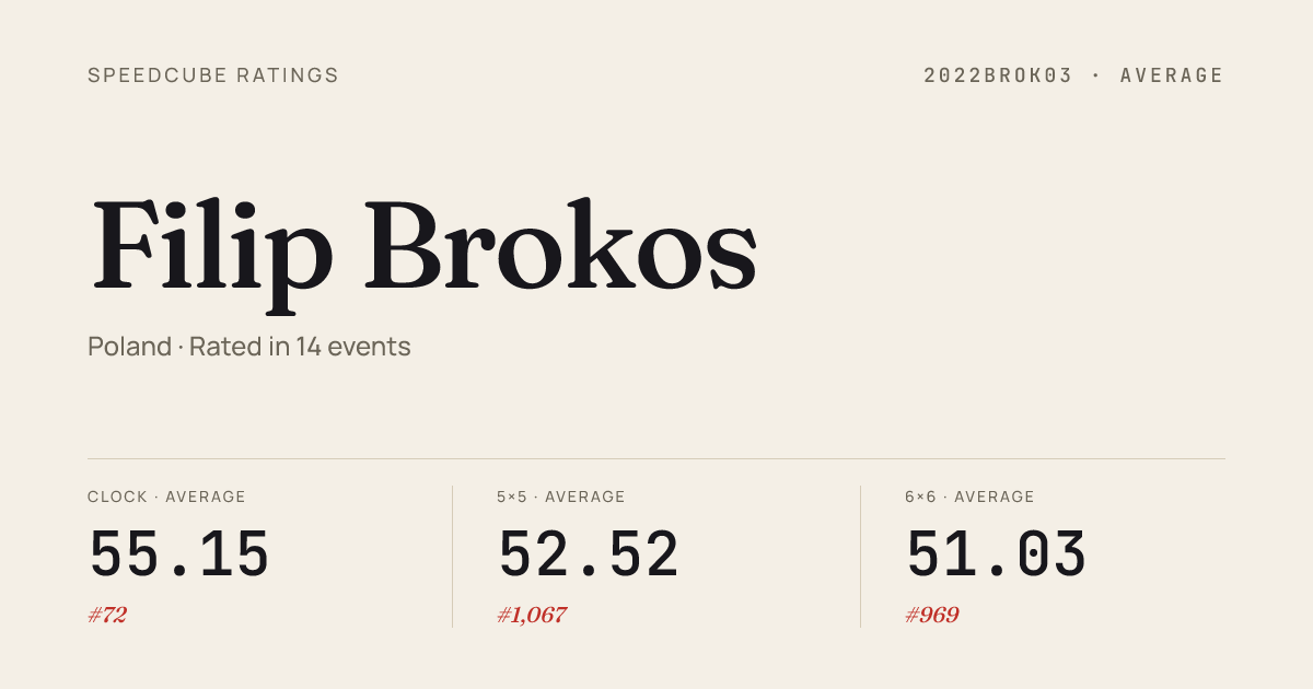 Apr 18, 20263x3x3 Cube · Round 2Cube4funBialaRawskaSpring2026 · 10th11.09Apr 18, 20263x3x3 One-Handed · Round 1Cube4funBialaRawskaSpring2026 · 12th30.50Apr 18, 2026Clock · FinalCube4funBialaRawskaSpring2026 · 1st4.21Apr 18, 2026Clock · Round 1Cube4funBialaRawskaSpring2026 · 2nd5.62Apr 18, 2026Pyraminx · Round 1Cube4funBialaRawskaSpring2026 · 4th4.75Apr 18, 2026Pyraminx · FinalCube4funBialaRawskaSpring2026 · 7th4.52Apr 18, 2026Skewb · Round 1Cube4funBialaRawskaSpring2026 · 17th8.34Mar 15, 20262x2x2 Cube · Round 1CubeFactoryLeagueRogow2026 · 34th4.02Mar 15, 20263x3x3 Cube · Round 2CubeFactoryLeagueRogow2026 · 23rd10.51Mar 15, 20263x3x3 Cube · Round 1CubeFactoryLeagueRogow2026 · 18th9.68Mar 15, 20263x3x3 Blindfolded · Round 1CubeFactoryLeagueRogow2026 · 13th1:34.04Mar 15, 20263x3x3 Blindfolded · FinalCubeFactoryLeagueRogow2026 · 11th1:21.19Mar 15, 20263x3x3 One-Handed · Round 1CubeFactoryLeagueRogow2026 · 31st24.90Mar 15, 20264x4x4 Cube · Round 1CubeFactoryLeagueRogow2026 · 15th36.53Mar 15, 2026Clock · Round 1CubeFactoryLeagueRogow2026 · 3rd3.59Mar 15, 2026Clock · FinalCubeFactoryLeagueRogow2026 · 2nd3.48Mar 15, 2026Megaminx · Round 1CubeFactoryLeagueRogow2026 · 25th1:09.05Mar 15, 2026Pyraminx · Round 1CubeFactoryLeagueRogow2026 · 27th5.72Mar 15, 2026Skewb · Round 1CubeFactoryLeagueRogow2026 · 25th6.23Feb 8, 20263x3x3 Cube · Round 1GLSBigCubesGdansk2026 · 12th9.74