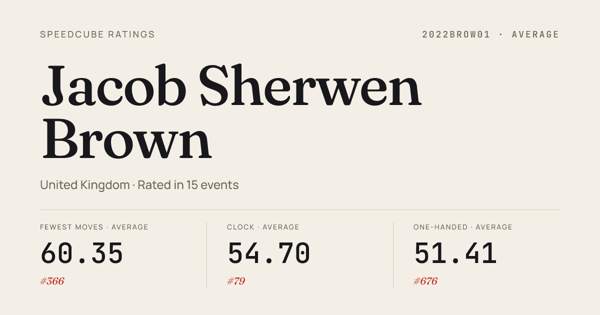 - Apr 18, 20263x3x3 Cube · Round 2Brighton3x3Day2026 · 3rd7.92