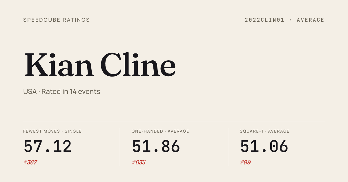 - Apr 11, 20263x3x3 One-Handed · Round 1ColoradoSpringsSpring2026 · 4th15.60