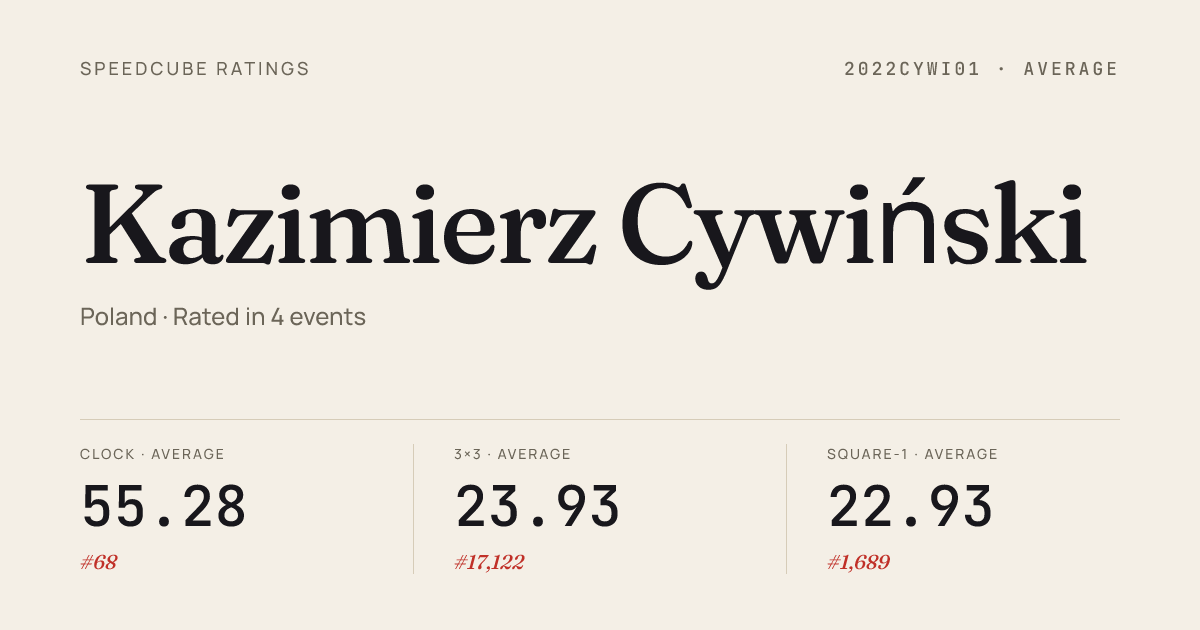 - Apr 12, 20263x3x3 Cube · Round 2OlsztynSpringOpen2026 · 31st17.46