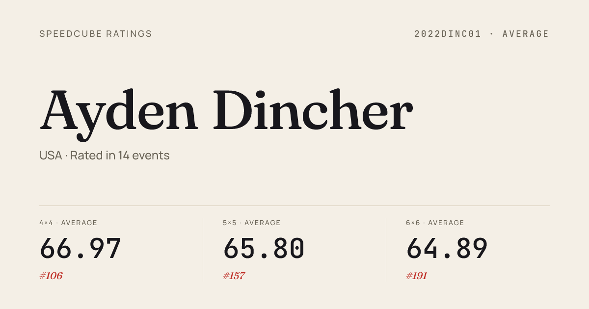 Apr 5, 20265x5x5 Cube · Round 1SideEventsinPalisades2026 · 2nd50.45Apr 5, 20266x6x6 Cube · FinalSideEventsinPalisades2026 · 5th1:40.70Apr 5, 20267x7x7 Cube · FinalSideEventsinPalisades2026 · 4th2:36.01Apr 5, 2026Megaminx · Round 1SideEventsinPalisades2026 · 10th49.11Apr 5, 2026Megaminx · FinalSideEventsinPalisades2026 · 8th50.89Apr 5, 2026Megaminx · Round 2SideEventsinPalisades2026 · 6th45.01Apr 5, 2026Square-1 · FinalSideEventsinPalisades2026 · 5th7.53Apr 5, 2026Square-1 · Round 1SideEventsinPalisades2026 · 4th8.26Apr 5, 2026Square-1 · Round 2SideEventsinPalisades2026 · 6th8.52Apr 4, 20263x3x3 Cube · FinalPBsinPalisadesSpring2026 · 2nd6.34Apr 4, 20263x3x3 Cube · Round 1PBsinPalisadesSpring2026 · 2nd6.48Apr 4, 20263x3x3 Cube · Round 2PBsinPalisadesSpring2026 · 6th7.59Apr 4, 20264x4x4 Cube · Round 1PBsinPalisadesSpring2026 · 3rd27.02Apr 4, 20264x4x4 Cube · FinalPBsinPalisadesSpring2026 · 3rd27.36Apr 4, 2026Clock · Round 1PBsinPalisadesSpring2026 · 15th6.41Apr 4, 2026Clock · FinalPBsinPalisadesSpring2026 · 3rd4.07Apr 4, 2026Clock · Round 2PBsinPalisadesSpring2026 · 14th6.06Apr 4, 2026Pyraminx · FinalPBsinPalisadesSpring2026 · 4th2.30Apr 4, 2026Pyraminx · Round 2PBsinPalisadesSpring2026 · 8th2.54Apr 4, 2026Pyraminx · Round 1PBsinPalisadesSpring2026 · 4th1.99