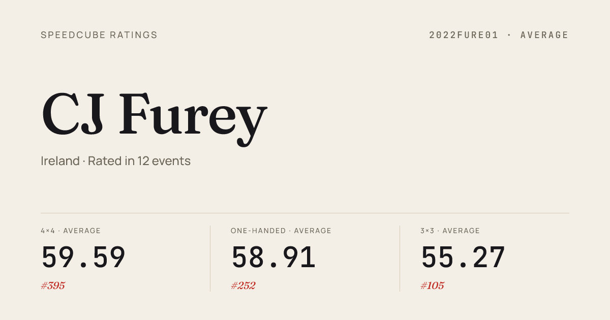 Mar 8, 2026Pyraminx · Round 1GortaGoFast2026 · 4th3.25Mar 8, 2026Pyraminx · FinalGortaGoFast2026 · 4th3.43Feb 8, 20263x3x3 Cube · Round 1LetsGoCarlow2026 · 1st7.12Feb 8, 20263x3x3 Cube · FinalLetsGoCarlow2026 · 1st6.67Feb 8, 20263x3x3 Cube · Round 2LetsGoCarlow2026 · 1st6.63Feb 8, 20264x4x4 Cube · Round 1LetsGoCarlow2026 · 2nd29.95Feb 8, 20264x4x4 Cube · FinalLetsGoCarlow2026 · 3rd28.78Feb 8, 20265x5x5 Cube · Combined FinalLetsGoCarlow2026 · 4th58.60Feb 8, 20266x6x6 Cube · Combined FinalLetsGoCarlow2026 · 7th2:41.58Jan 17, 20262x2x2 Cube · FinalDublinPickNMix2026 · 2nd2.03Jan 17, 20263x3x3 Cube · FinalDublinPickNMix2026 · 2nd7.64Jan 17, 20263x3x3 Cube · Round 1DublinPickNMix2026 · 1st6.94Jan 17, 20263x3x3 One-Handed · Combined FinalDublinPickNMix2026 · 1st13.04Jan 17, 20264x4x4 Cube · Combined FinalDublinPickNMix2026 · 1st32.04Dec 14, 20253x3x3 Cube · Round 1LeopardstownCubeRaces2025 · 1st6.57Dec 14, 20253x3x3 Cube · FinalLeopardstownCubeRaces2025 · 1st6.12Dec 14, 20255x5x5 Cube · Combined FinalLeopardstownCubeRaces2025 · 5th1:03.57Dec 14, 2025Clock · Combined FinalLeopardstownCubeRaces2025 · 11th7.58Dec 14, 2025Pyraminx · Round 1LeopardstownCubeRaces2025 · 4th3.85