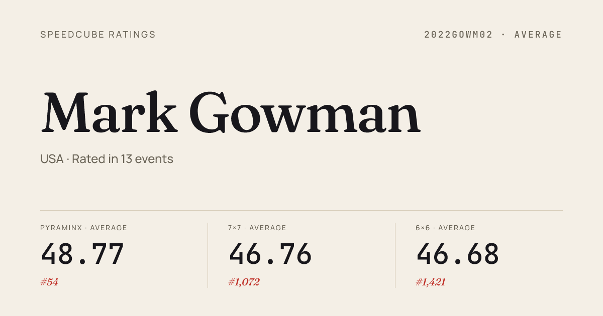 Apr 12, 20264x4x4 Cube · FinalOberliNxN2026 · 10th41.80Apr 12, 20264x4x4 Cube · Round 1OberliNxN2026 · 10th42.03Apr 12, 20265x5x5 Cube · Round 1OberliNxN2026 · 10th1:15.05Apr 12, 20265x5x5 Cube · FinalOberliNxN2026 · 9th1:13.47Apr 12, 20266x6x6 Cube · Round 1OberliNxN2026 · 8th2:17.20Apr 12, 20266x6x6 Cube · Round 2OberliNxN2026 · 8th2:13.56Apr 12, 20267x7x7 Cube · Round 2OberliNxN2026 · 7th3:14.98Apr 12, 20267x7x7 Cube · Round 1OberliNxN2026 · 7th3:22.86Mar 29, 20262x2x2 Cube · Round 2ReturntoGreenOH2026 · 11th4.13Mar 29, 20262x2x2 Cube · Round 1ReturntoGreenOH2026 · 13th4.13Mar 29, 20262x2x2 Cube · FinalReturntoGreenOH2026 · 10th3.25Mar 29, 20263x3x3 Cube · FinalReturntoGreenOH2026 · 8th11.04Mar 29, 20263x3x3 Cube · Round 2ReturntoGreenOH2026 · 6th10.08Mar 29, 20263x3x3 Cube · Round 1ReturntoGreenOH2026 · 6th10.15Mar 29, 20265x5x5 Cube · Round 1ReturntoGreenOH2026 · 8th1:18.49Mar 29, 20265x5x5 Cube · FinalReturntoGreenOH2026 · 7th1:10.76Mar 29, 2026Pyraminx · Round 1ReturntoGreenOH2026 · 2nd2.90Mar 29, 2026Pyraminx · FinalReturntoGreenOH2026 · 1st2.34Mar 29, 2026Skewb · FinalReturntoGreenOH2026 · 5th4.73